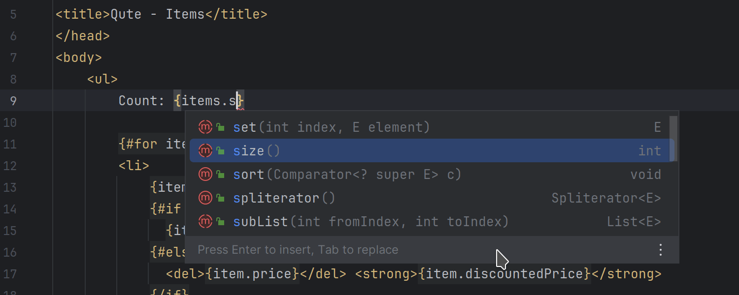 IntelliJ IDEA Ultimate 现已支持 Quarkus Qute 类型安全模板,这意味着它现在可为形参声明、可用形参和形参实例成员提供代码补全。 您还可以使用 Find Usages(查找用法,Ctrl+Alt+Shift+F7)和 Go to Declaration(转到声明,Ctrl + B)导航到模板中的形参用法。