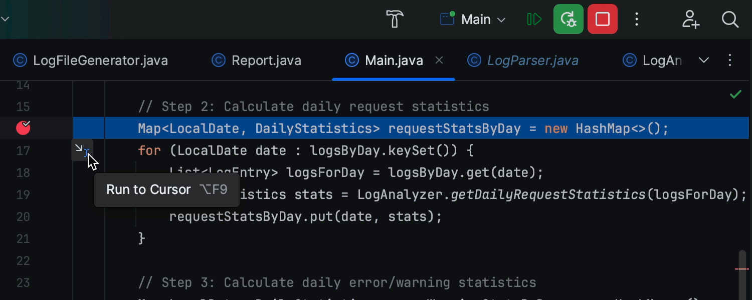 IntelliJ IDEA 2023.3 引入了一个新的 Run to Cursor(运行到光标)嵌入选项,该选项允许您在调试时执行到特定代码行。 程序挂起后,您可以将鼠标悬停在要执行到的代码行上,然后点击 Run to Cursor(运行到光标)弹出窗口。 您还可以在将文本光标置于所需行上后调用键盘快捷键 (Alt + F9) 来使用此功能。