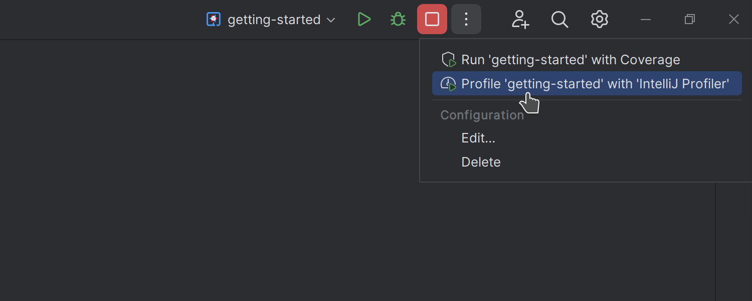 您可以为 Quarkus 项目使用 Run with Coverage(使用覆盖率运行)和 Profile with IntelliJ Profiler(使用 IntelliJ Profiler 分析)。 两种运行配置都可以直接从 Run(运行)微件轻松访问。