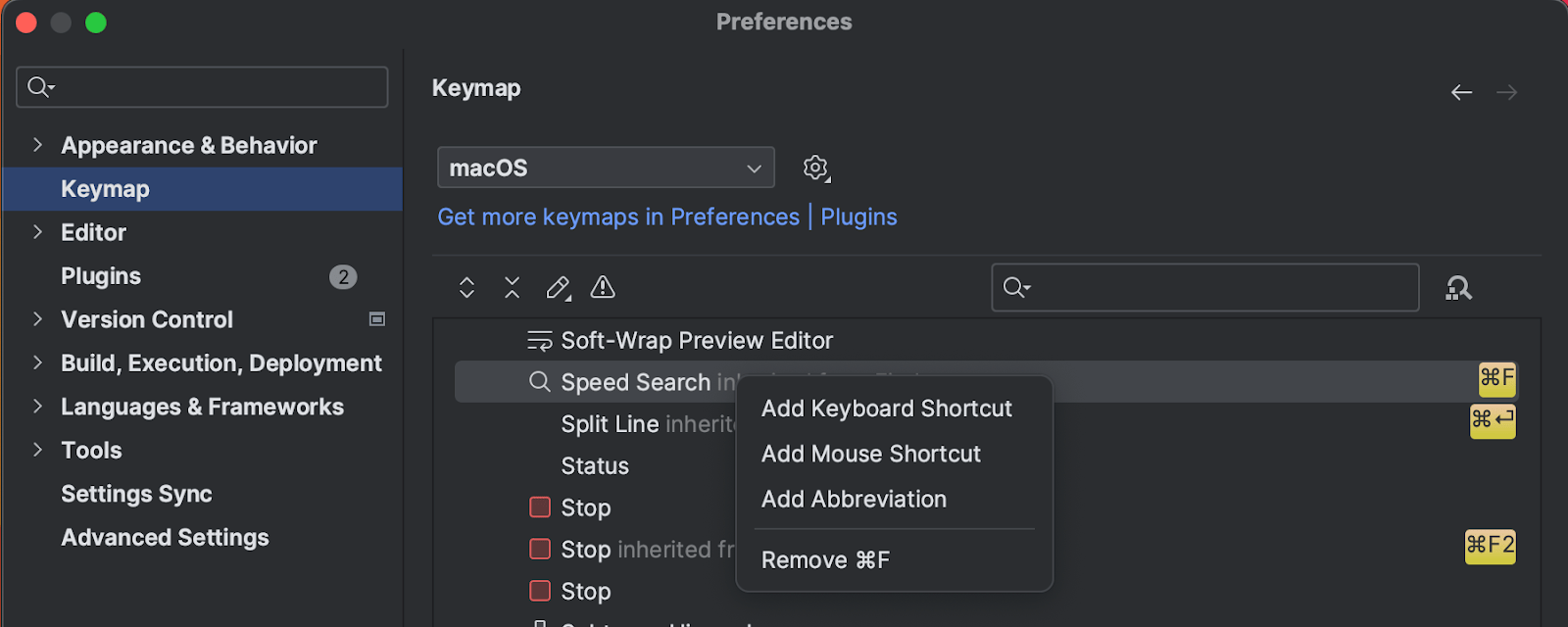 Speed Search(快速搜索)功能允许您在工具窗口和对话框中快速导航,现在可以通过快捷键使用。 将焦点置于树或列表上后,即可从工具窗口的 Options(选项)菜单轻松调用搜索。 您也可以使用快捷键 Ctrl+F,或者直接输入查询。 您可以在 Settings / Preferences | Keymap(设置/偏好设置 | 按键映射)中为 Speed Search(快速搜索)功能指定自定义快捷键。