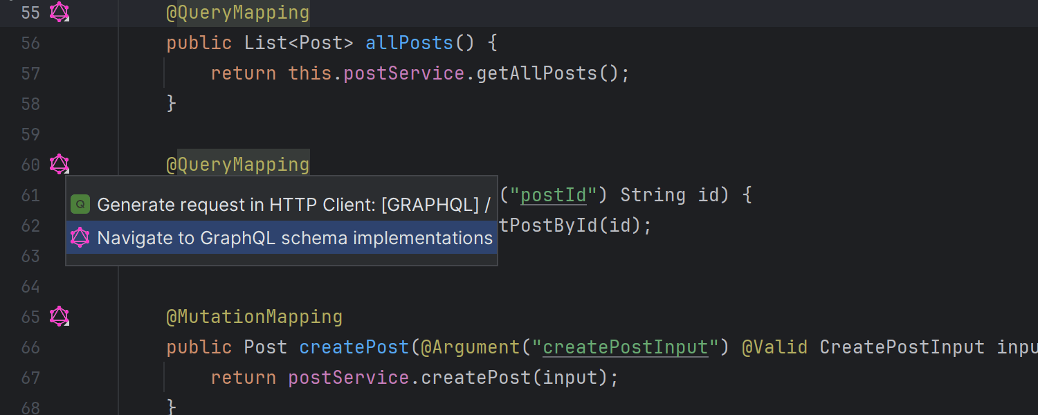 我们引入了新的 Spring GraphQL 插件,为开发使用 GraphQL Java 构建的 Spring 应用程序添加了多个有价值的功能。 安装插件后,IDE 会为 Spring GraphQL 提供代码导航和补全建议以及架构映射。 您还可以导航到 GraphQL 架构实现并在 Endpoints(端点)工具窗口中查看。