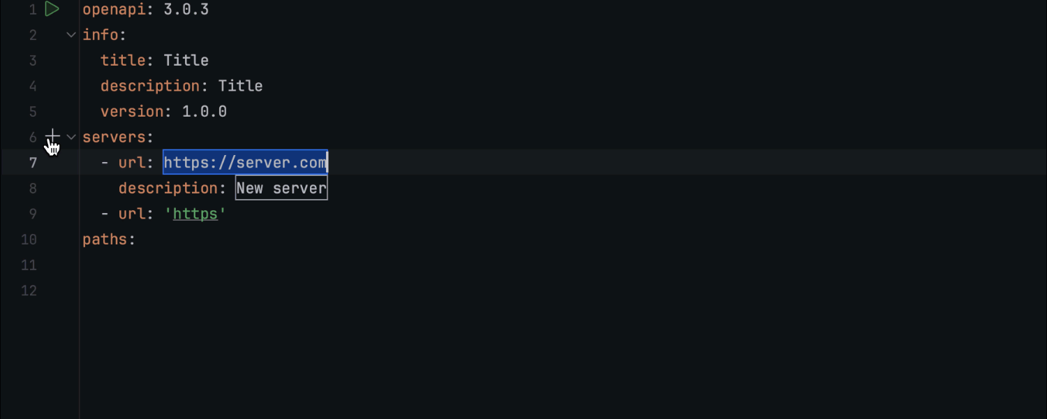 我们实现了可视化编辑功能,帮助您使用实时模板快速编写格式良好的 OpenAPI 规范。 这些操作适用于 YAML 和 JSON 文件。 要为对象插入模板,只需将鼠标悬停在装订区域的相关行上,然后点击 + 图标。