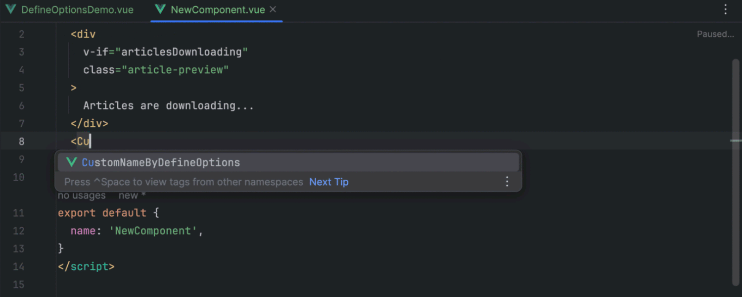 我们添加了对 defineSlots 的支持,为 slot 名称提供补全和导航,以及重命名重构。 我们还通过 defineExpose 为属性引入了补全支持。 在 IntelliJ IDEA Ultimate 2023.3 中,组件的必需 import 将根据 defineOptions 函数指定的名称添加。