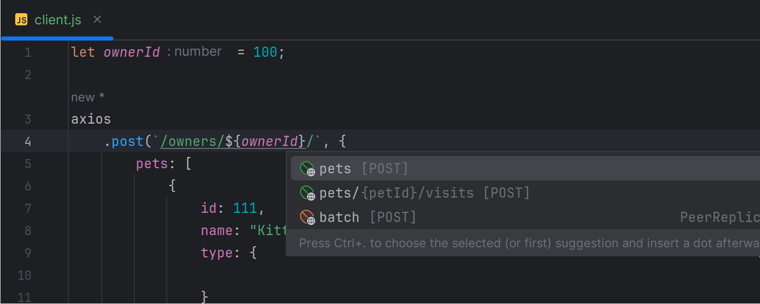 我们改进了处理 URL 的代码补全功能。 现在,在需要 URL 路径的位置输入 / 时,IDE 将自动使用服务器端点的 URL 填充代码补全弹出窗口。 操作时,它会考虑应用程序中的可用 API 和附加的 OpenAPI 规范,帮助您更快指定 URL 路径。