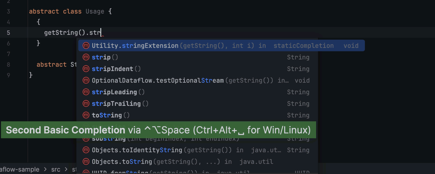 我们增强了实用方法的代码补全,这些方法通常为 static 并且位于其他类中。 现在,当目标类是第一个形参时,static 方法将被视为与实例方法相同,这使得相关补全建议更易被发现。 为了使代码补全弹出窗口保持整洁,以及实用方法的建议更易查找,我们将其收集到一个列表中,这个列表会在您第二次调用代码补全时显示。 随着功能的发展,未来可能发生变化。