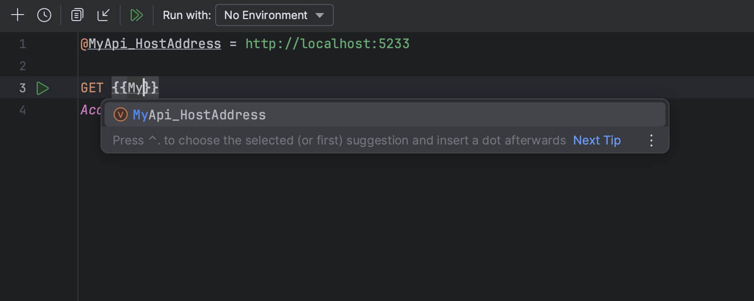 HTTP 客户端现在支持使用 @ 声明变量。 您不再需要任何额外环境文件来跨请求重用值,并且 IDE 为值提供了代码补全,让您可以轻松添加。