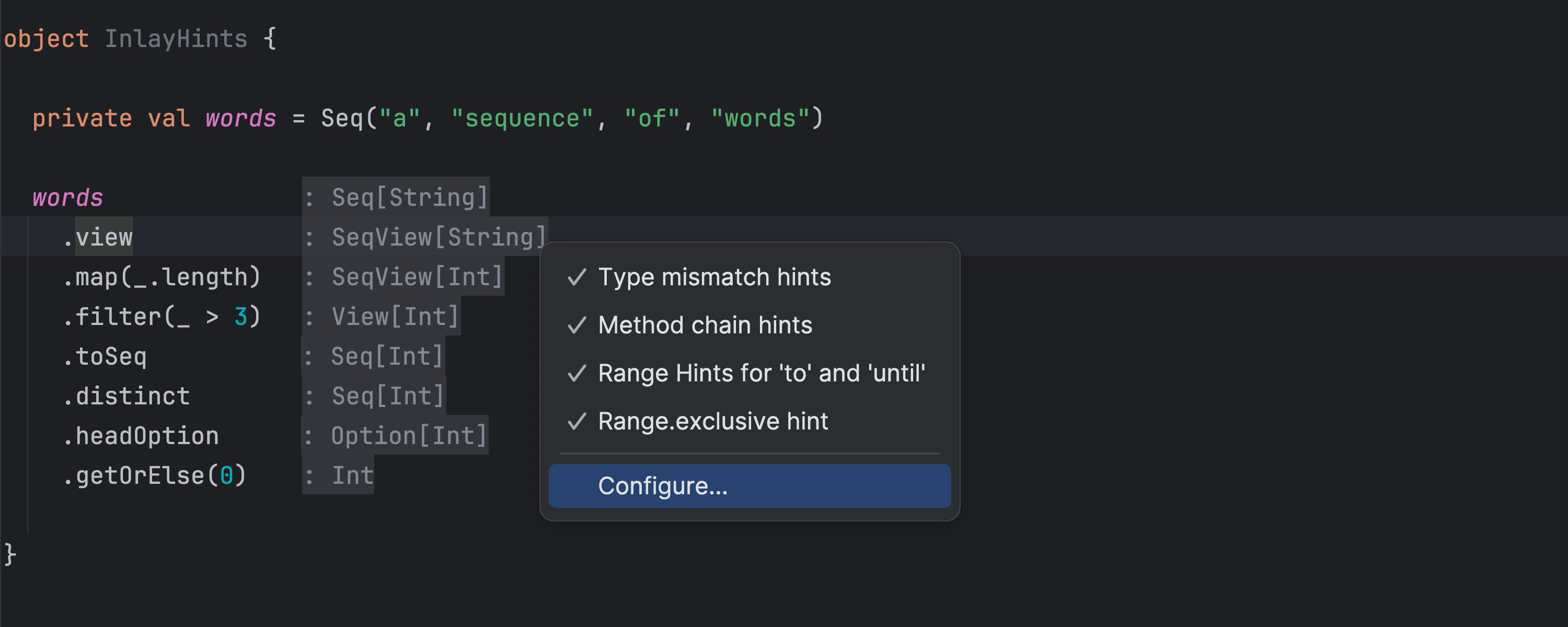 在 IntelliJ IDEA 2023.3 中,我们改进了为 Scala 配置嵌入提示的工作流,让您可以更轻松地了解可用的嵌入提示类型以及使用方式。 这些提示现已对齐并位于屏幕右侧,确保不会遮挡代码。