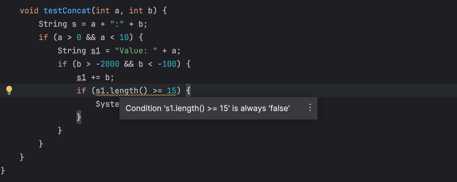 识别和高亮显示始终计算为相同值的条件表达式中的潜在错误时,IntelliJ IDEA 的代码分析现已涵盖更多场景。 例如,IDE 现在可以识别可能的字符串长度或估计字符串串联结果,在检测到冗余或可能有问题的代码时提示检查。 了解详情。