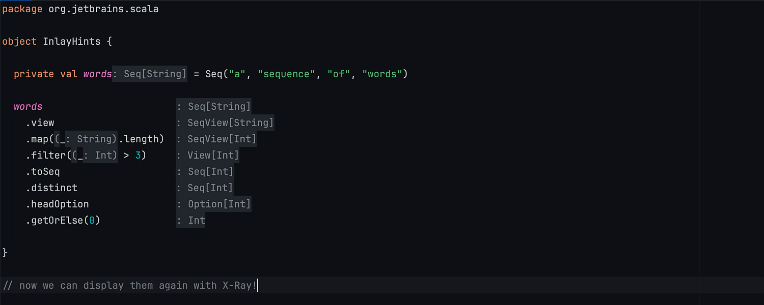 编辑器中显示的嵌入提示和其他信息旨在增强代码可读性和简化编码。 但是,详细信息过多可能会使界面变得混乱。 借助针对 Scala 的新 X-Ray 功能,您可以禁用这些提示,然后在需要额外信息时双击并按住 Ctrl 将其重新打开。 这可以保持编辑器整洁,直到您想要查阅提示为止。