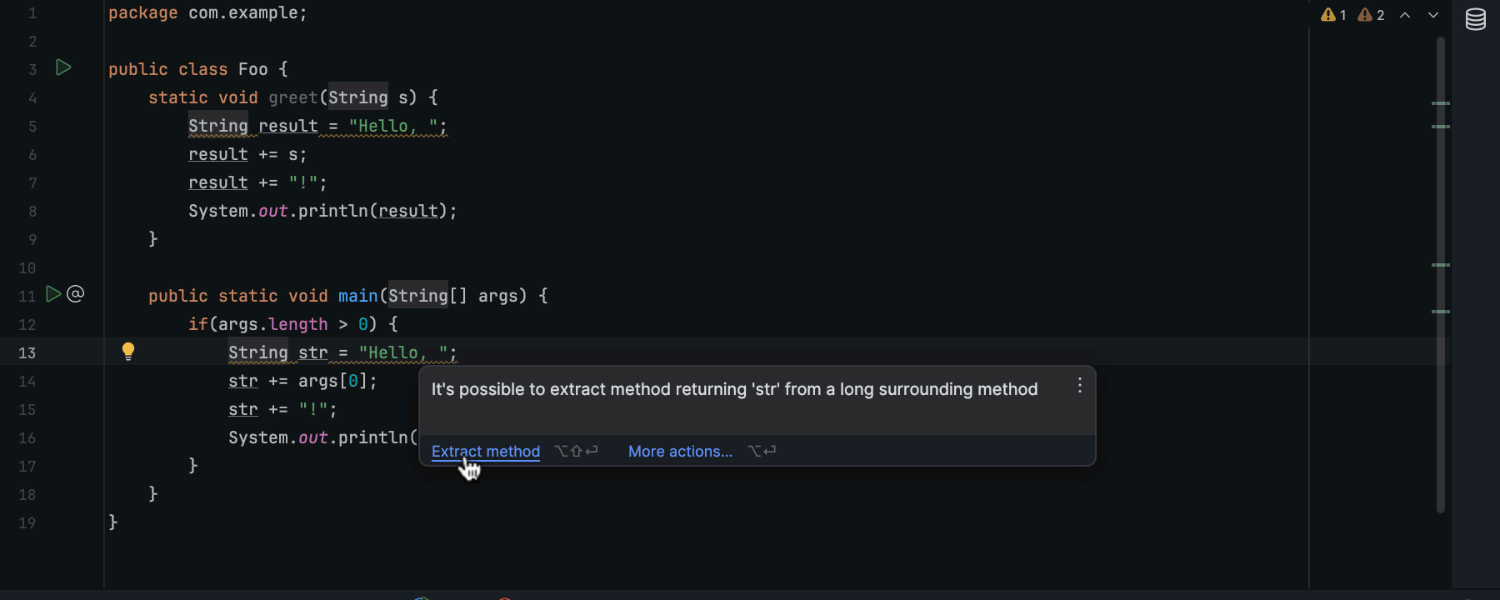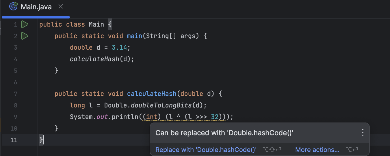 我们为 Java 实现了新的检查和快速修复,帮助您保持代码整洁无误。 为清楚起见,IDE 现在会检测可被替换为对 Long.hashCode() 或 Double.hashCode() 方法的调用的按位操作。 此外,新的快速修复可以根据代码库的要求简化隐式和显式类声明之间的切换。 另一项新检查为匹配代码段建议使用现有 static 方法,使代码可以轻松重用,无需引入额外 API。 此外,IDE 现在可以检测并报告永远不会执行的无法访问的代码。