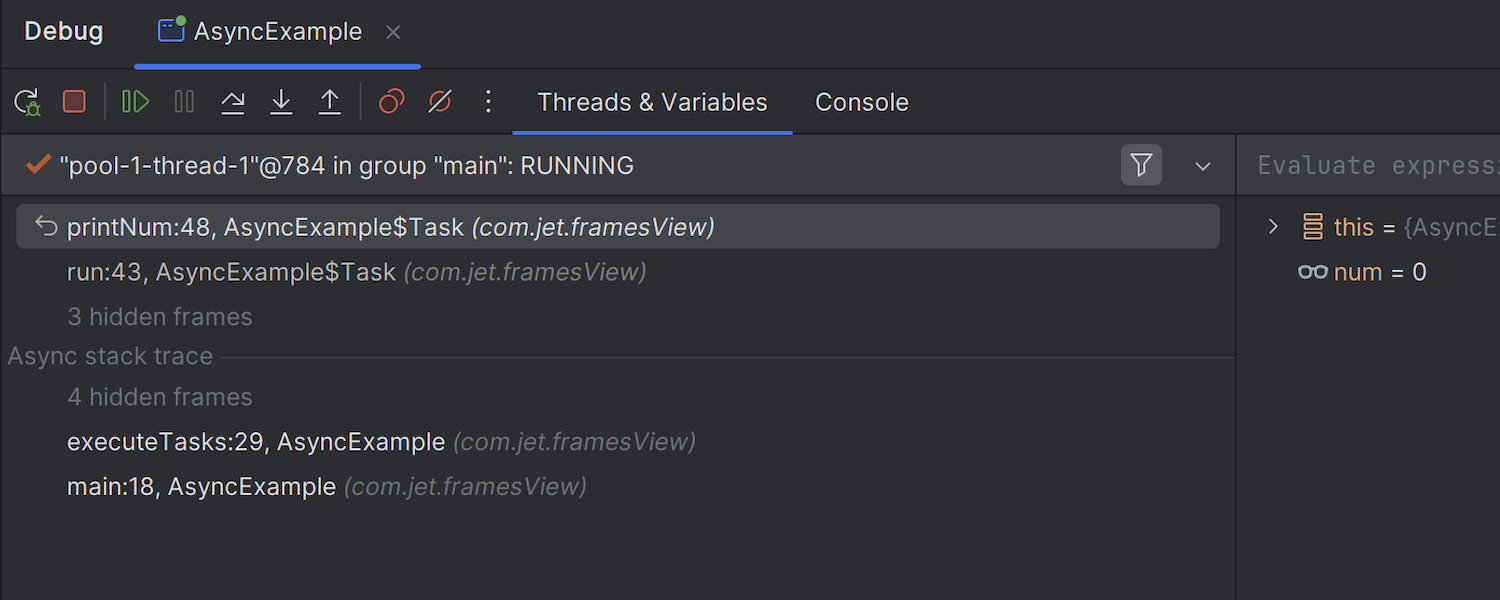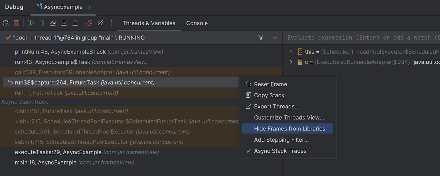 现在,库调用在 Debug(调试)工具窗口的调用堆栈中默认折叠,帮助您在浏览代码时保持专注。 但是,如果您需要验证库调用序列,可以展开组并相应地探索帧。 要显示列表,请使用工具栏中的 Filter(筛选器)图标或调用上下文菜单并禁用 Hide Frames from Libraries(在库中隐藏帧)选项。