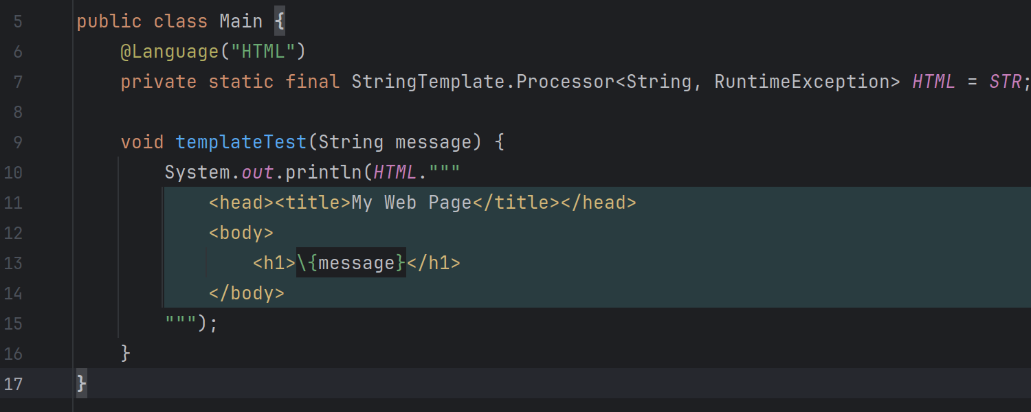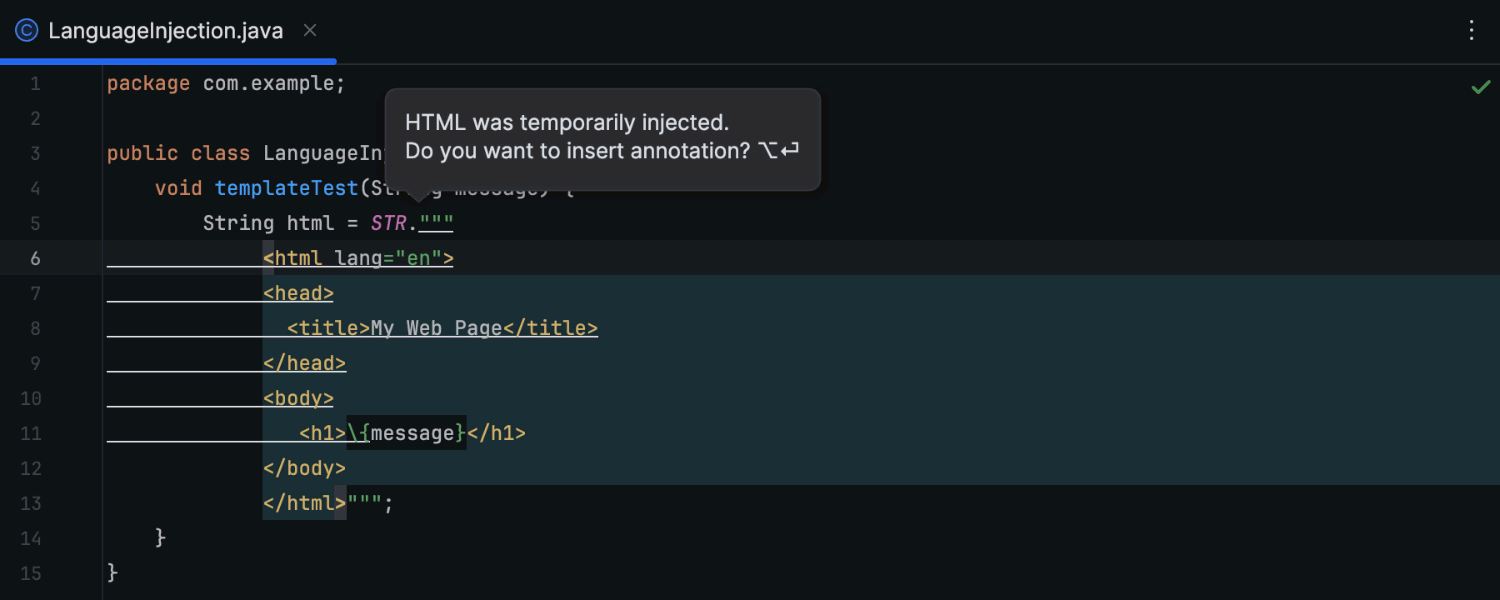 IntelliJ IDEA 2024.1 引入了将语言注入字符串模板的功能。 您可以使用注解,注解会自动选择所需语言,也可以使用 Inject language or reference(注入语言或引用)意图操作 (Alt+Enter) 从列表中手动选择语言。 如果您使用后一种方式,IDE 将建议您插入语言注解。 执行注入后,您可以再次调用意图操作列表,并选择在独立编辑器窗格中打开和编辑注入的片段。