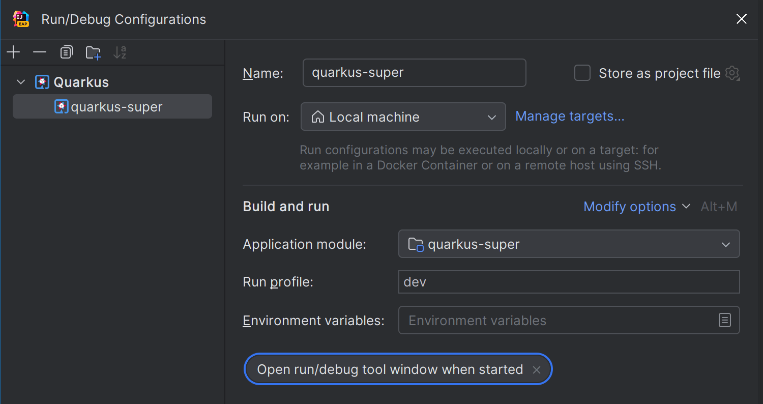 我们为 Quarkus 运行配置引入了一个新的设置编辑器。 现在,Run/Debug Configuration(运行/调试配置)对话框为 Maven 和 Gradle 项目提供了改进的 UI,使用户可以轻松访问 Run profile(运行配置文件)和 Environment variables(环境变量)等常用设置。 您可以通过新增到 Run(运行)工具窗口工具栏的图标方便地访问 Quarkus Dev UI。
