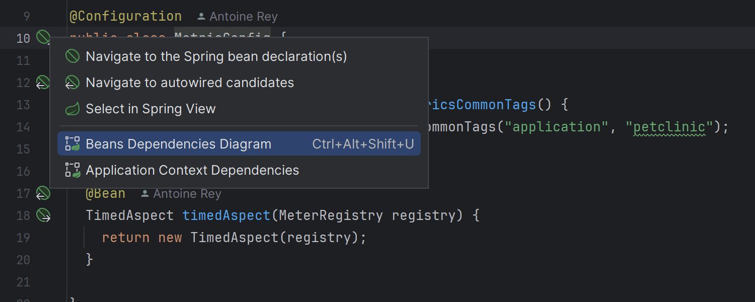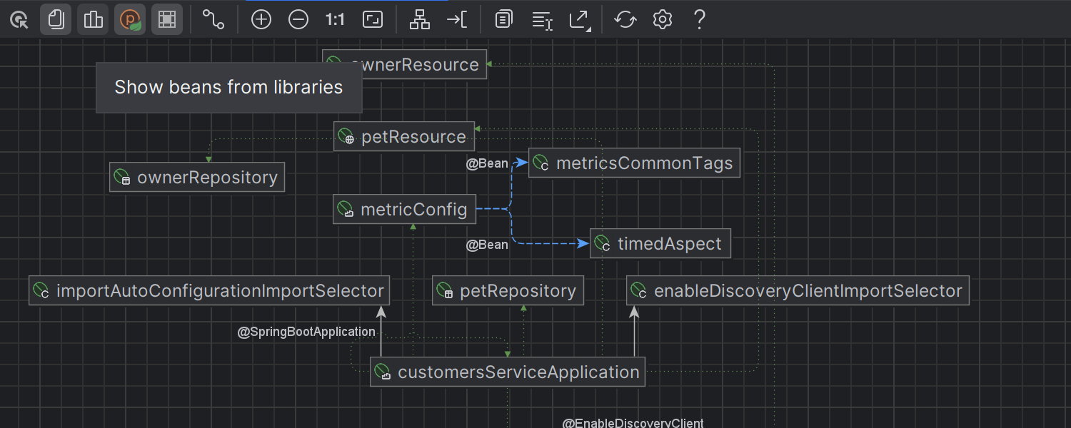 我们使 Spring 模型图表更易访问。 您可以使用 Bean 行标记或对 Spring 类使用意图操作 (Alt+Enter) 进行调用。 我们为 Spring 图表引入了新的图标,增强了 Spring 原型(如组件、控制器、仓库和配置 Bean)的可视化。 此外,您现在可以方便地切换库中 Bean 的可见性(默认隐藏)。