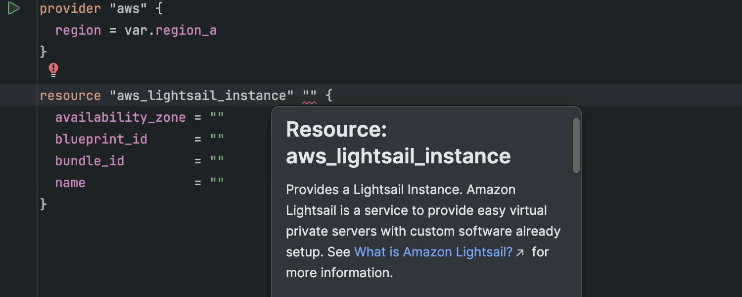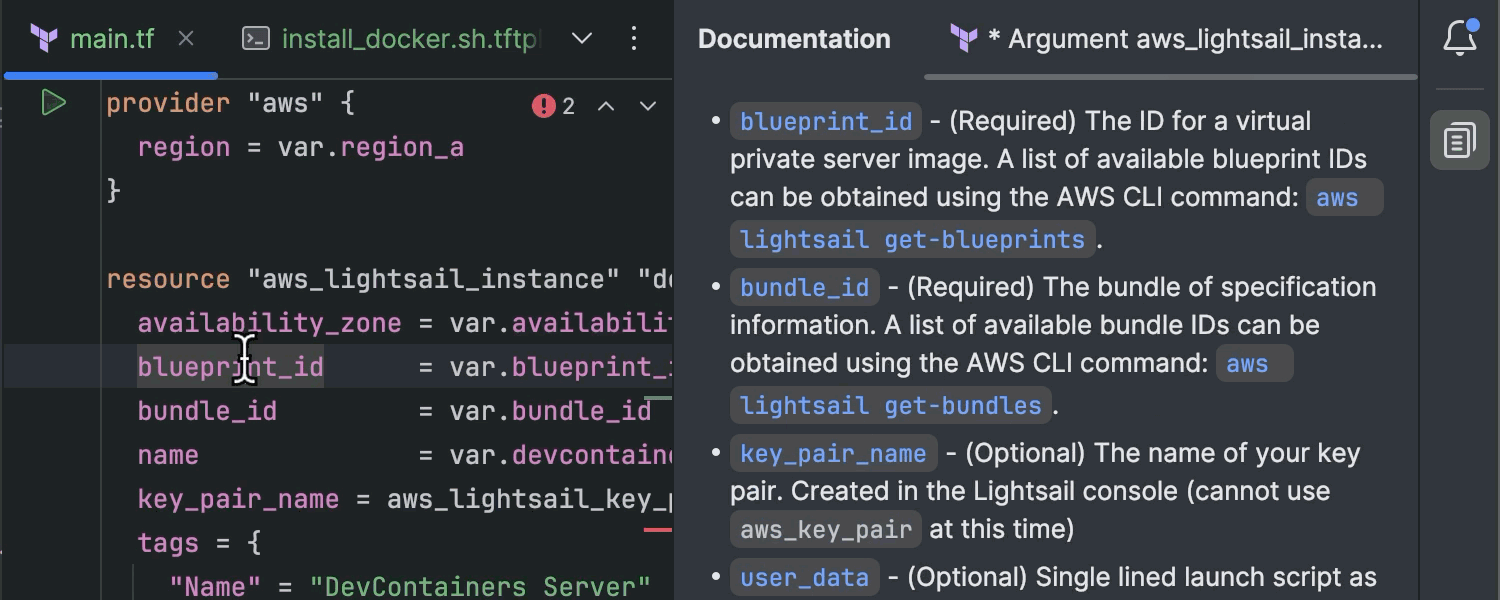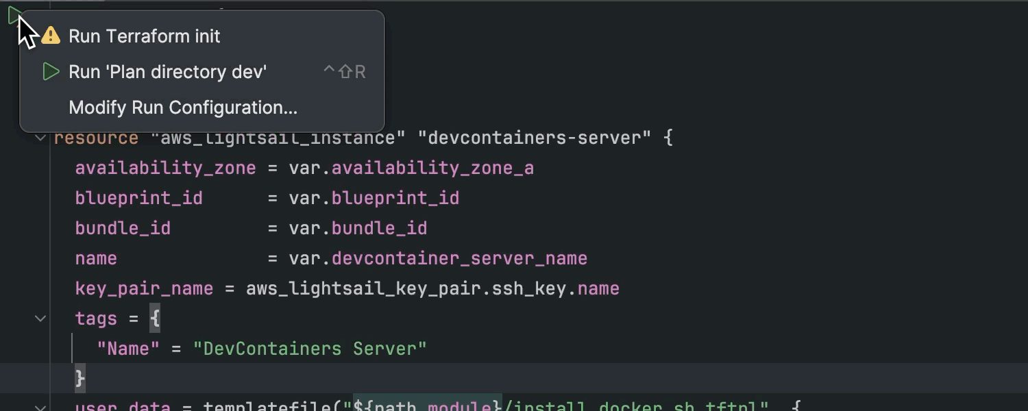 IntelliJ IDEA Ultimate 2024.1 带来了改进的 Terraform 支持,有助于简化创建、管理和扩展基础架构的流程。 现在,IDE 通过明确建议运行 terraform init 来简化初始化,并为超过 3,900 个第三方 Terraform 提供程序提供了扩展的代码补全功能。 此外,IDE 还引入了对 Terraform 模板语言 (tftpl) 的支持,实现动态模板,可以与您的首选编程语言无缝集成。 您可以在我们的博文中找到更多详细信息。
