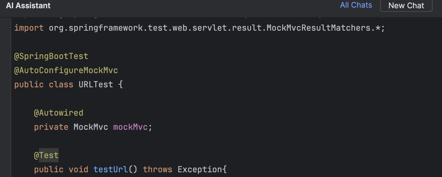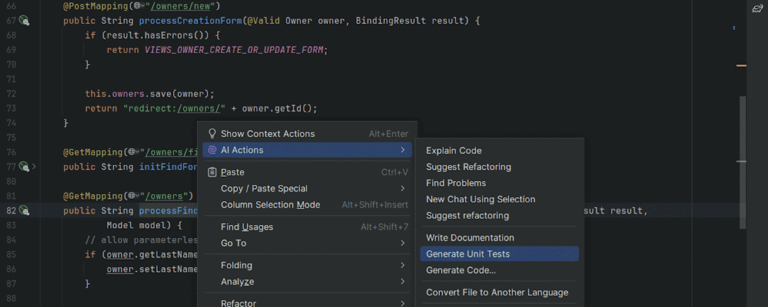 AI Assistant 获得了多项有价值的更新,包括改进的测试生成和云代码补全、提交消息的自定义提示语、从代码段创建文件的功能,以及更新的编辑器内代码生成。 在这篇博文中了解详情。