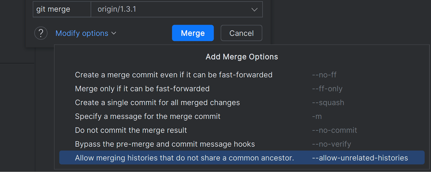 Merge into(合并到)对话框的下拉菜单中新增了 Allow unrelated histories(允许不相关的历史记录)选项。 选择后,该选项允许合并两个分支,即使它们没有共同的历史记录。