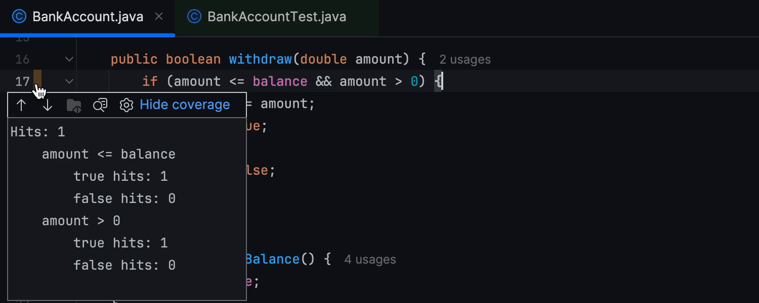 版本 2024.1 使 IntelliJ IDEA 距离实现全面测试覆盖又近了一步。 这项更新的重点是确定测试未完全覆盖代码中的哪些条件语句。 现在,IntelliJ IDEA 既显示哪一行具有未覆盖的条件,还会指定未覆盖的条件分支或变量值。 这项功能默认启用,您可以在 Settings/Preferences | Build, Execution, Deployment | Coverage(设置/偏好设置 | 构建、执行、部署 | 覆盖率)进行控制。
