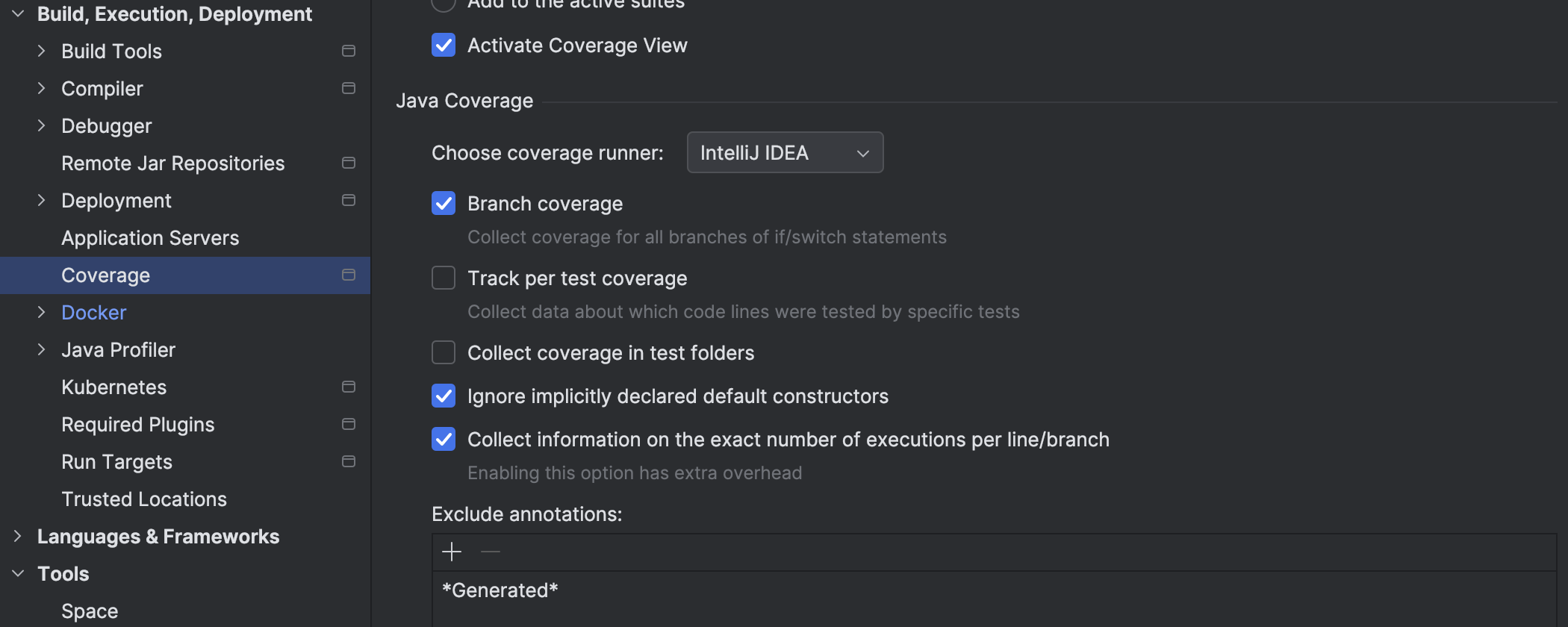 代码覆盖率设置已从 Run Configuration(运行配置)弹出窗口移至 Settings/Preferences | Build, Execution, Deployment | Coverage(设置/偏好设置 | 构建、执行、部署 | 覆盖率)。 经过这一改动,不必为每次测试运行单独更新配置即可选择覆盖率运行程序或启用高级功能,例如跟踪哪些测试覆盖特定代码行。