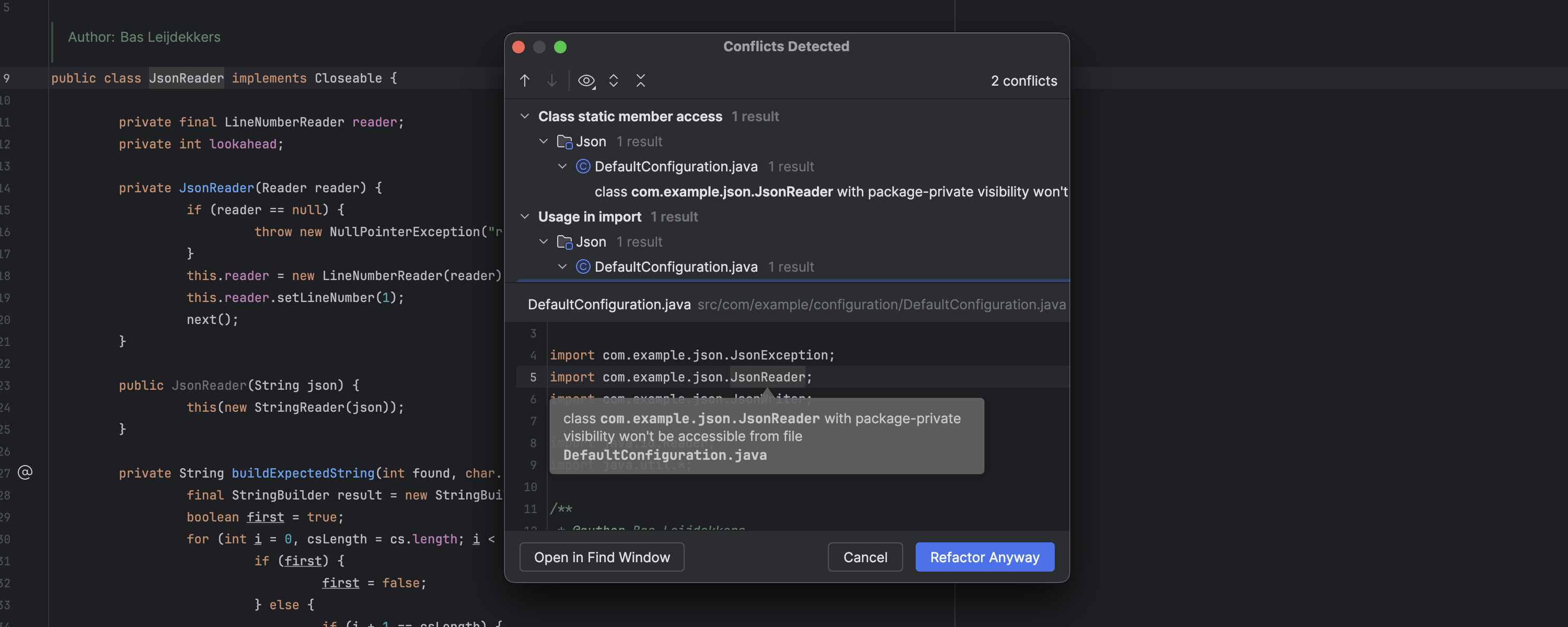 在版本 2024.1 中,我们重做了 Conflicts Detected(检测到冲突)对话框以提高可读性。 现在,对话框中的代码反映了编辑器中的内容,使您可以更清楚地了解冲突,并且 IDE 会自动保存窗口大小调整以供将来使用。 另外,我们还更新了按钮及其行为以简化重构工作流,对话框现在可以完全通过键盘访问,您可以使用快捷键和箭头键进行无缝交互。