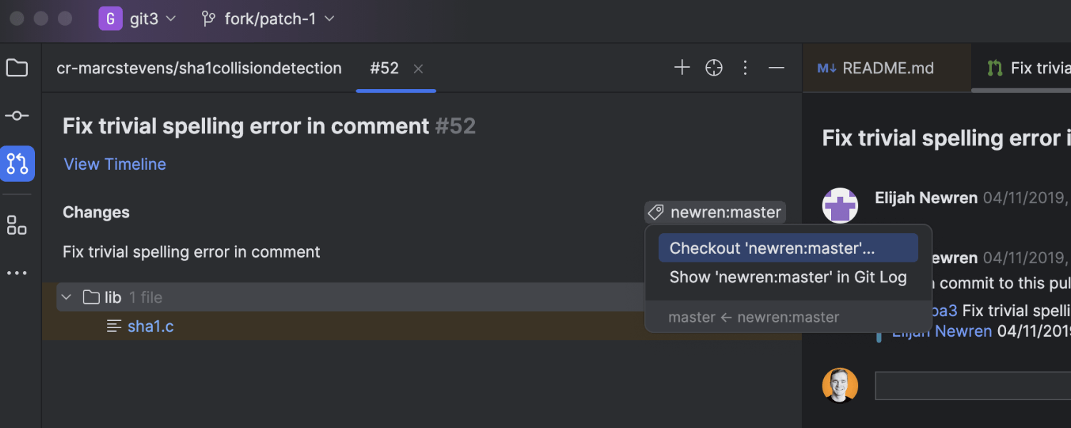 IntelliJ IDEA 2024.1 通过提供分支相关更改的集中视图简化了代码审查工作流。 对于 GitHub、GitLab 和 Space,现在可以在 Git 工具窗口中的单独 Log(日志)标签页中查看具体分支中的更改。 为此,点击 Pull Requests(拉取请求)工具窗口中的分支名称,然后从菜单中选择 Show in Git Log(在 Git 日志中显示)。