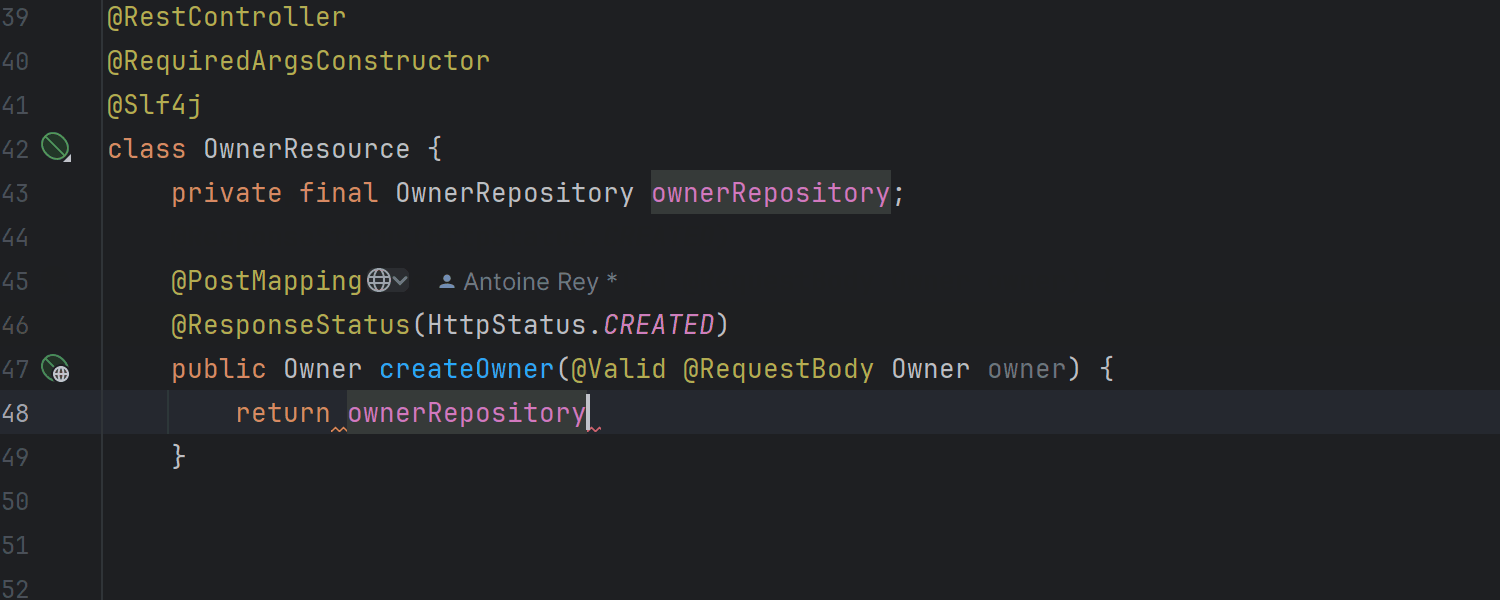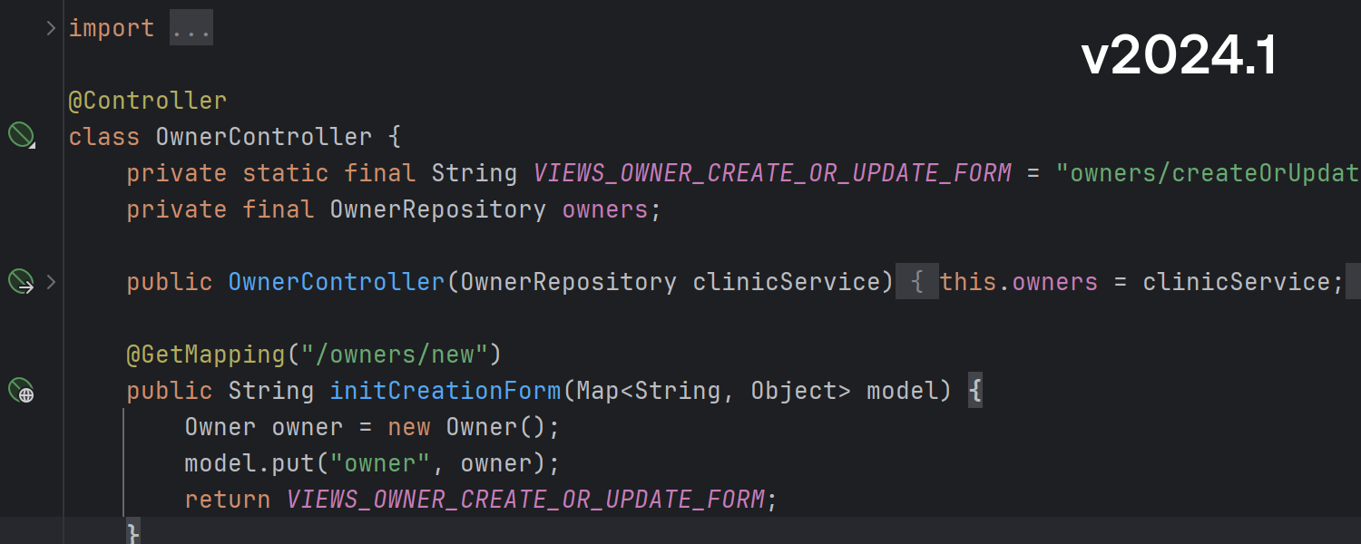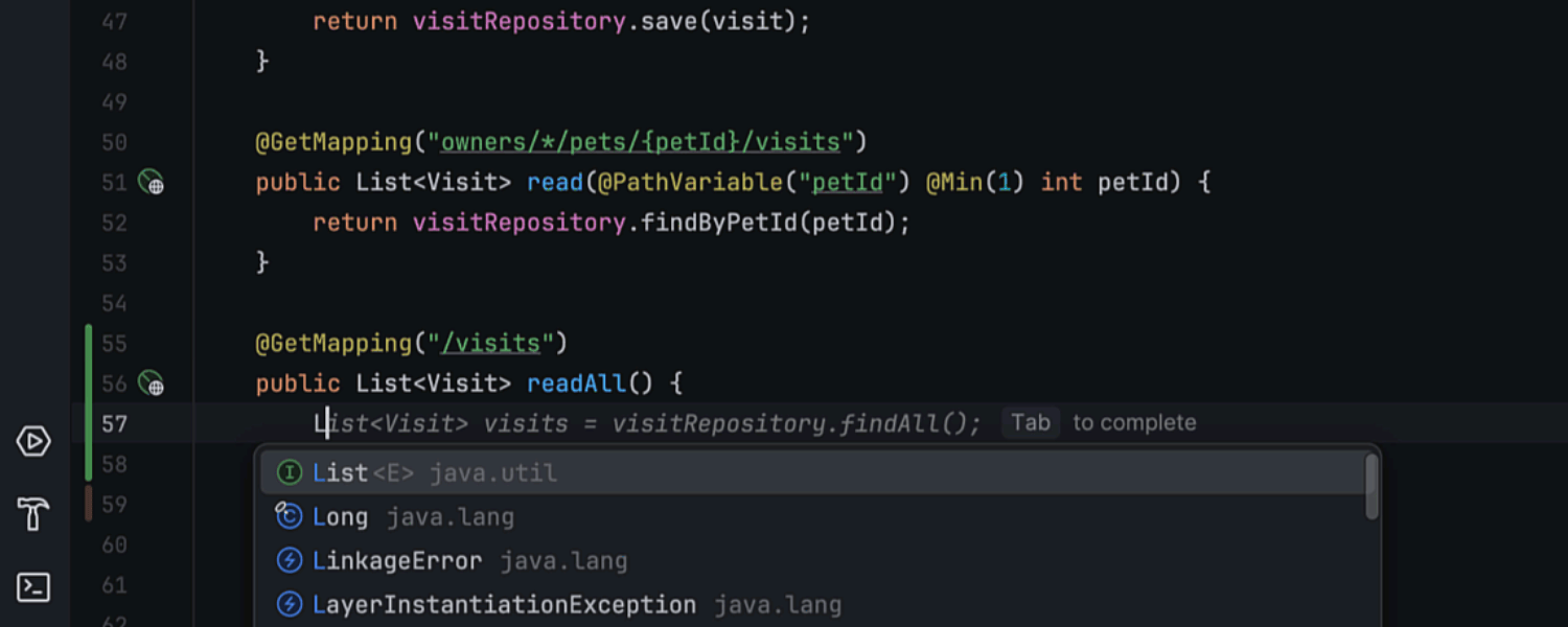 IntelliJ IDEA Ultimate 现在为应用程序上下文中的所有 Bean 提供自动补全,并自动装配 Bean。 如果 Bean 通过构造函数自动装配依赖项,则相关字段也会通过构造函数自动装配。 同样,如果依赖项是通过字段或 Lombok 的 @RequiredArgsConstructor 注解注入,则新 Bean 会自动通过字段装配。