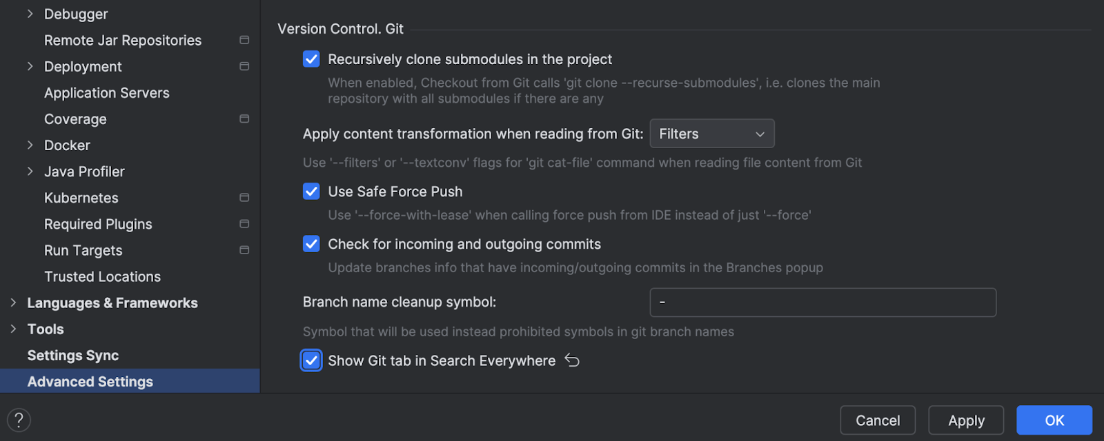 分析使用统计数据后,我们默认从 Search Everywhere 对话框中移除了 Git 标签页。 如果要将其恢复,可以使用 Settings / Preferences | Advanced Settings | Version Control. Git(设置/偏好设置 | 高级设置 | 版本控制. Git)中的 Show Git tab in Search Everywhere。