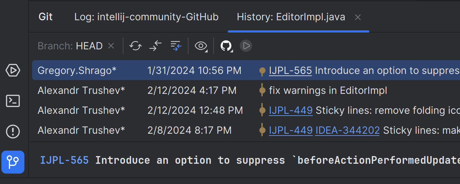 在 Git 工具窗口中,Show all branches(显示所有分支)按钮已被替换为分支筛选器,允许您审查对指定分支内的文件所做的更改。 我们还调整了工具栏的方向,将其水平放置以提高实用性。