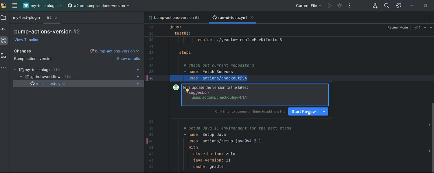 借助实现的新审查模式,IntelliJ IDEA 2024.1 为 GitHub 和 GitLab 用户引入了增强的代码审查体验。 此功能与编辑器集成,促进作者与审查者直接互动。 在检查拉取/合并请求分支时,审查模式会自动激活,并在装订区域中显示粉色标记,表明代码更改可供审查。 点击这些标记会弹出一个显示原始代码的弹出窗口,这样您就能快速识别哪些代码已被更改。 装订区域图标可以帮助您迅速发起新讨论,以及查看和隐藏现有讨论。 这些图标还可以让用户方便地访问评论,从而轻松查看、回复和作出反应。 在我们的博文中详细了解此更改。