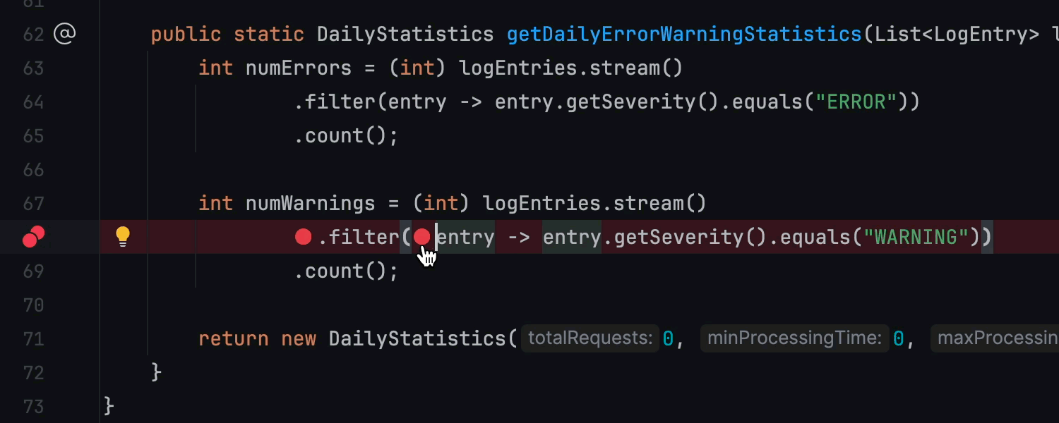 IntelliJ IDEA 2024.1 为在包含 lambda 函数或 return 语句的行中的断点设置提供了更方便的工作流。 点击装订区域设置断点后,IDE 会自动显示可在其中设置额外断点的内联标记。 每个断点都可以独立配置,释放高级调试功能。