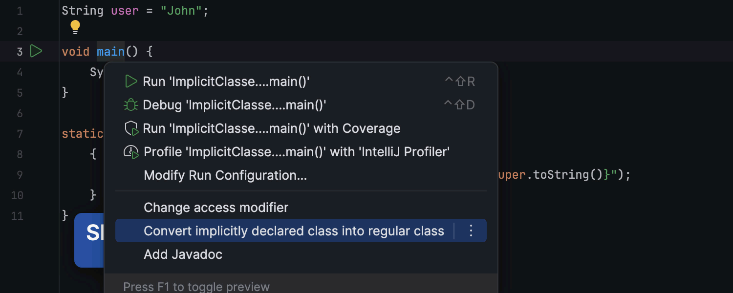 IntelliJ IDEA 2024.1 提供了对 2024 年 3 月发布的 JDK 22 中的功能集的支持, 支持覆盖未命名变量与模式的最终迭代、字符串模板与隐式声明的类的第二个预览版,以及实例 main 方法。 此外,此更新还引入了对 super(...) 之前预览状态下的 new 语句的支持。 在这篇博文中了解详情。