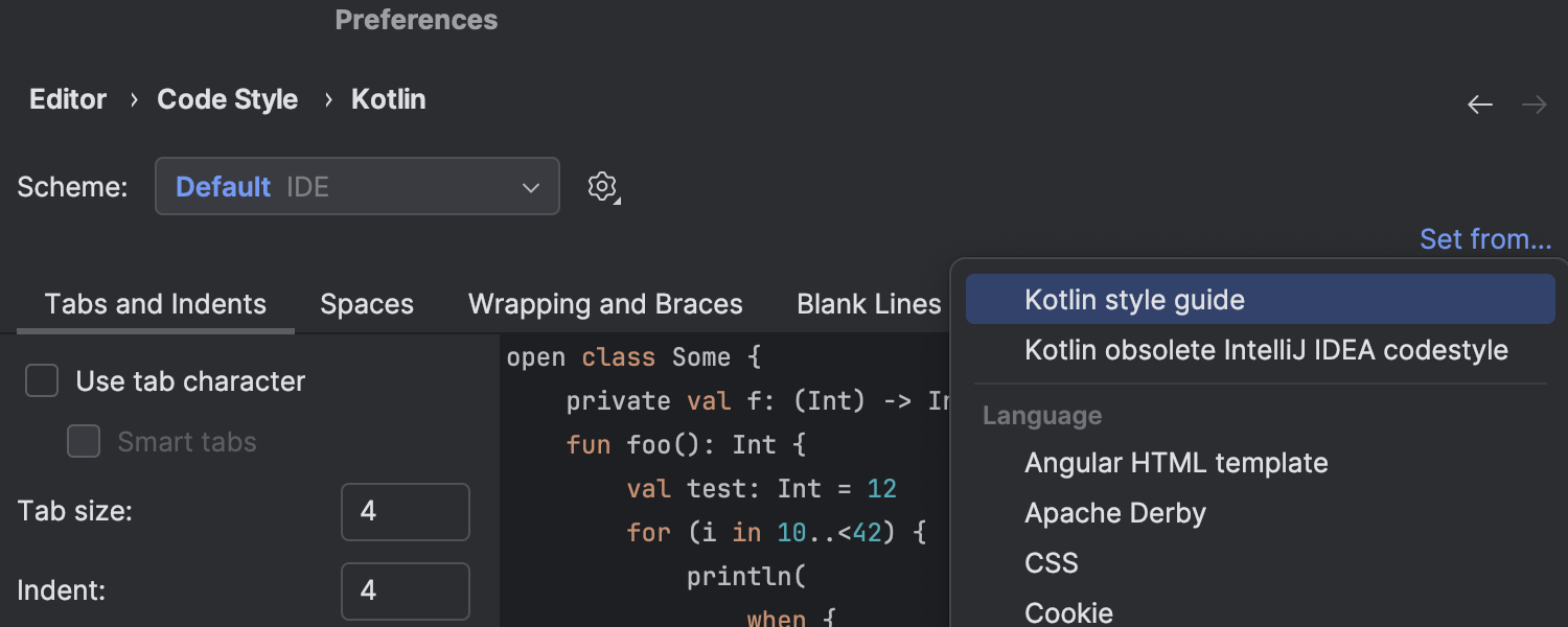 从版本 2024.1 开始,除非另有明确指定,否则 IDE 统一应用官方 Kotlin 样式指南作为所有项目的默认选项。 如果现有项目恰巧使用较旧的代码样式而未显式配置,IDE 将自动切换到 Kotlin 编码约定代码样式,并提醒您此更改。 为了防止不必要的格式更改,我们建议您了解此代码样式迁移指南。