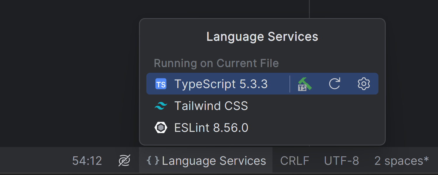 您将在状态栏上找到新的 Language Services(语言服务)微件,它可以提供对当前文件和项目的有效语言服务的洞察。 您可以直接从此微件重新启动服务或导航至其设置。
