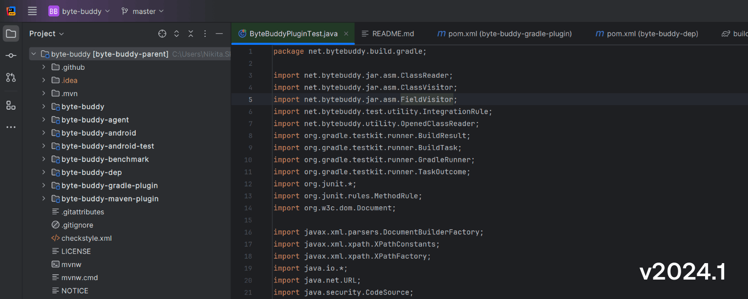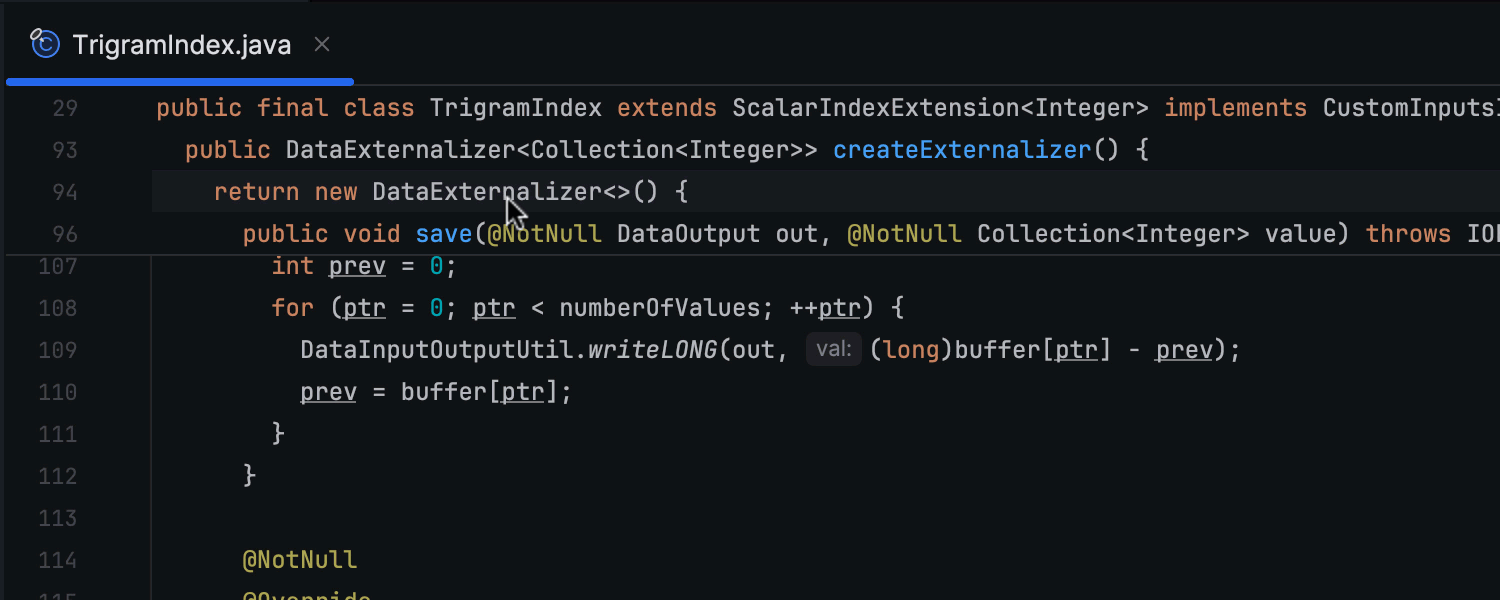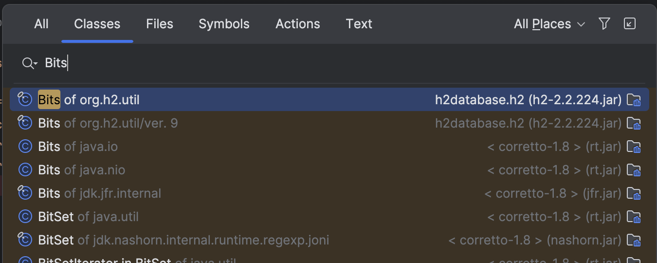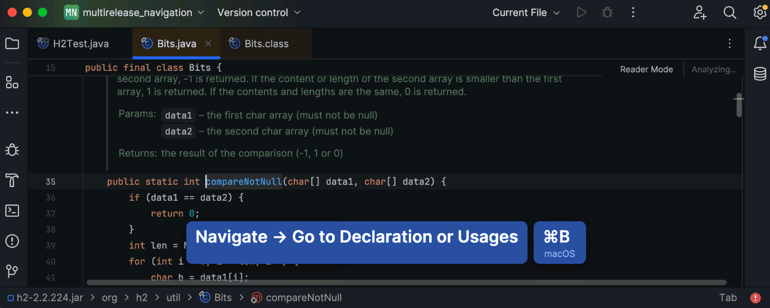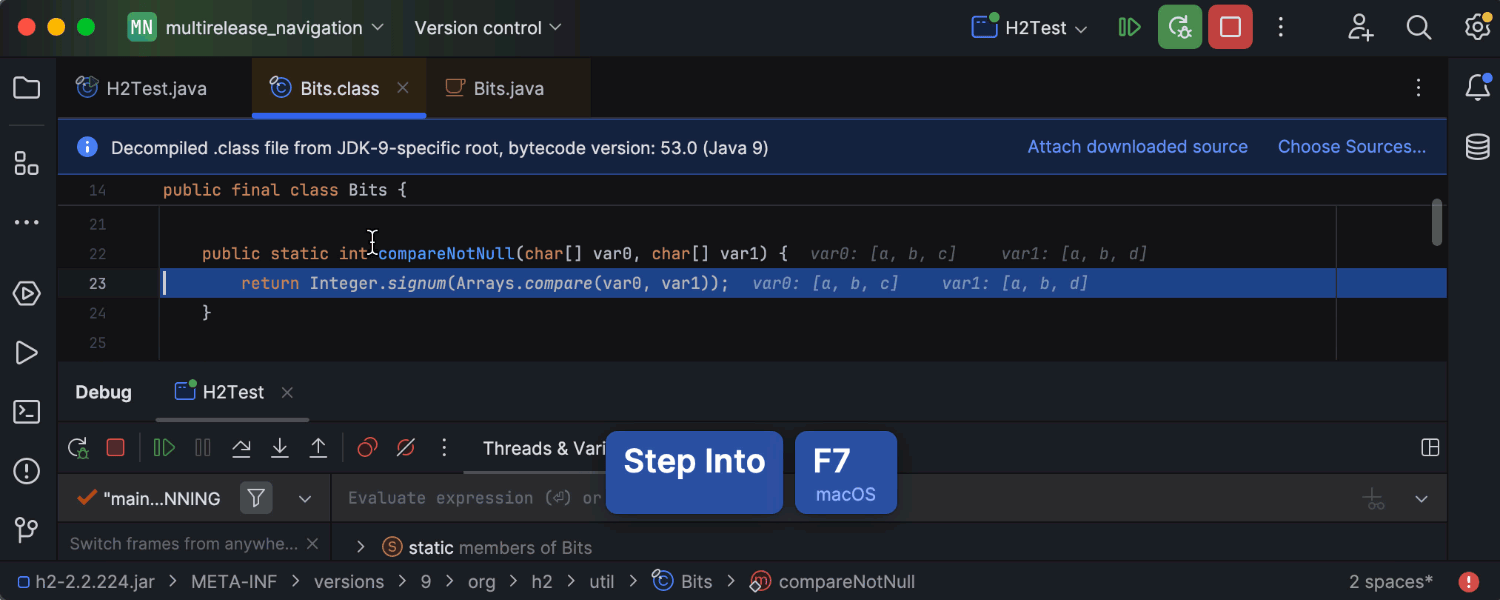 IntelliJ IDEA 2024.1 通过多版本 JAR 库提供增强的用户体验。 使用具有不同版本的类时,Go to declaration(转到声明)功能现在会根据当前模块的语言级别从 JAR 中选择正确的版本。 此外,Go to class(转到类)功能还提供有关类版本的额外信息。 调试期间使用 Step Into(步入)时,IDE 会将您带到与 JDK 版本而不是模块语言级别对应的类。