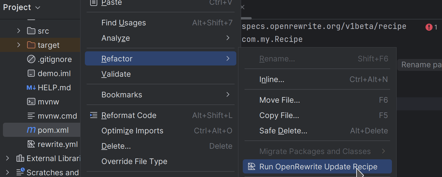 IntelliJ IDEA Ultimate 2024.1 集成了 OpenRewrite,这将扩展 IDE 的现有重构功能,并为您提供一个用于提高代码质量、一致性和可维护性的工具包。 借助 OpenRewrite 的资源,您可以现代化遗留代码、优化性能并处理复杂的迁移任务,例如升级到新的 Spring Boot 版本。