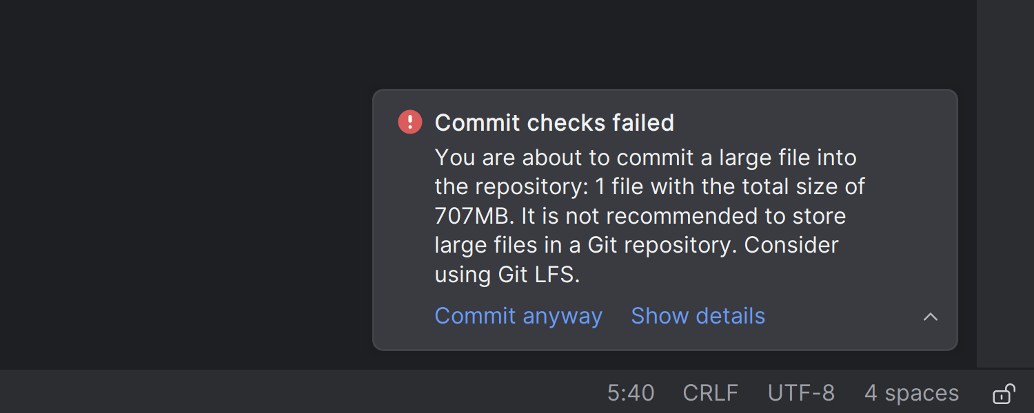 为了帮助您避免由于文件过大而导致版本控制拒绝,IDE 现在包含预提交检查,防止您提交此类文件并通知您该限制。