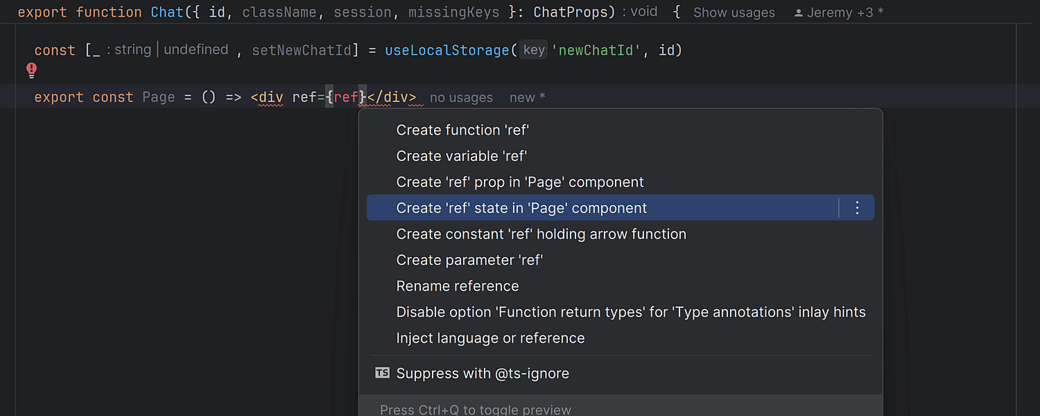 IntelliJ IDEA Ultimate 2024.1 为 React 引入了多个新的快速修复,可供动态创建 props 和状态。 您可以使用快捷键 Alt+Enter 应用这些快速修复。