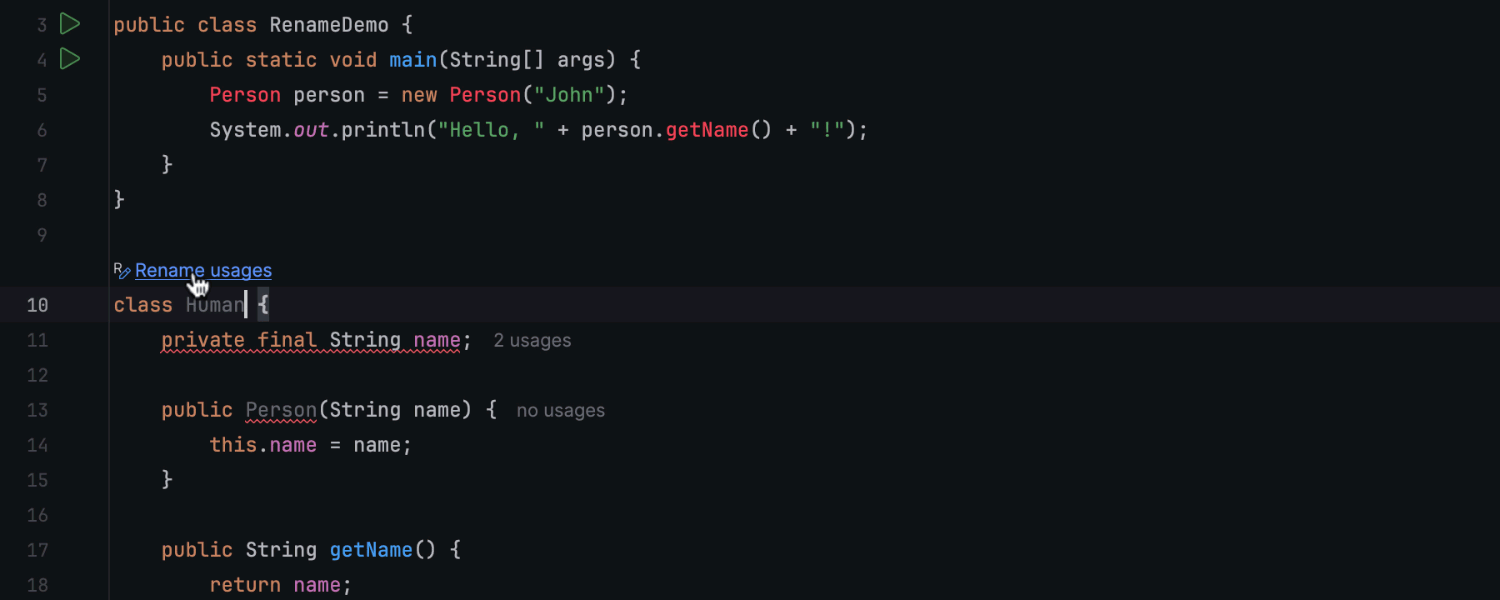 为了使重命名流程更简单、更直观,我们实现了一个新的嵌入提示,在更改的代码元素上显示。 要将代码库中的所有引用更新为新版本,点击此提示并确认更改即可。