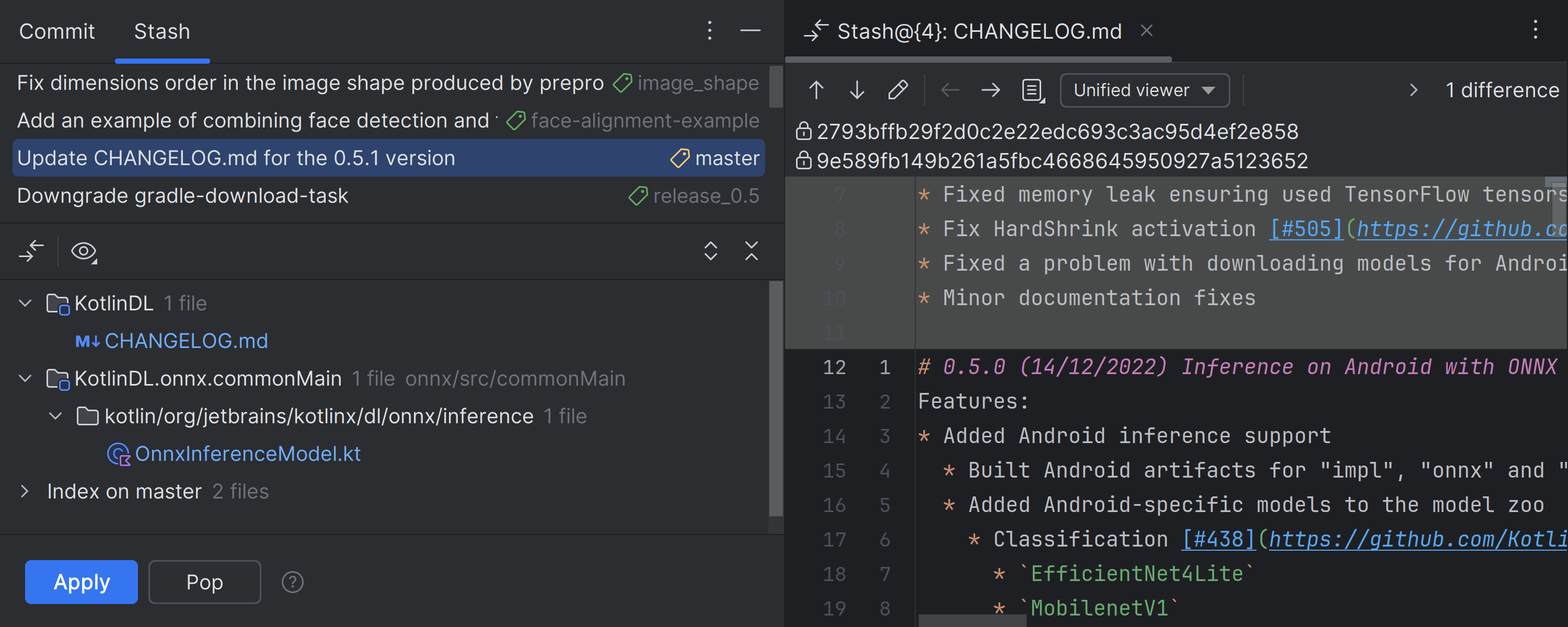对于依赖隐藏来存储临时未提交更改的用户,我们在 Commit(提交)工具窗口中引入了一个专属标签页以便访问。 如果您同时使用隐藏和搁置,则可以通过 Settings/Preferences | Version Control | Git(设置/偏好设置 | 版本控制 | Git)中的相应复选框启用组合的 Stashes and Shelves(隐藏和搁置)标签页。