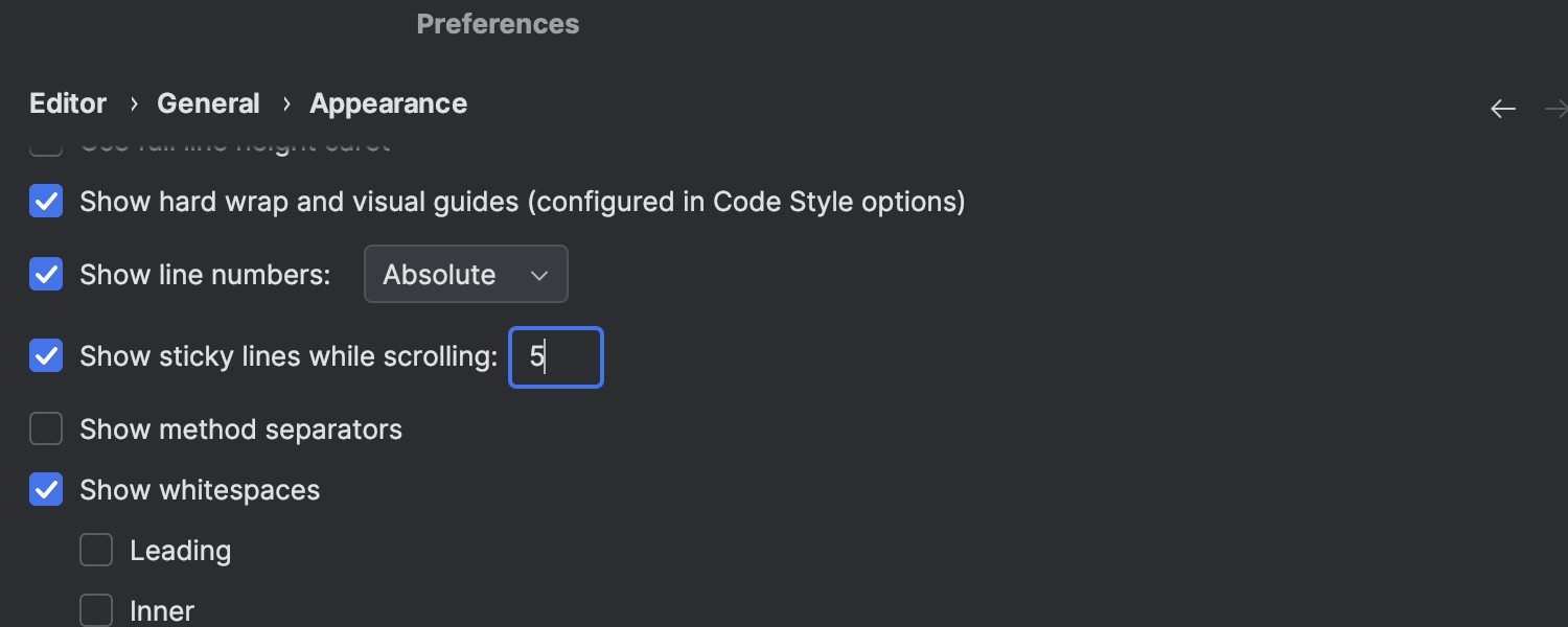 我们在编辑器中引入了粘性行,旨在简化大文件的处理和新代码库的探索。 滚动时,此功能会将类或方法的开头等关键结构元素固定到编辑器顶部。 这将使作用域始终保持在视野中,您可以点击固定的行快速浏览代码。
