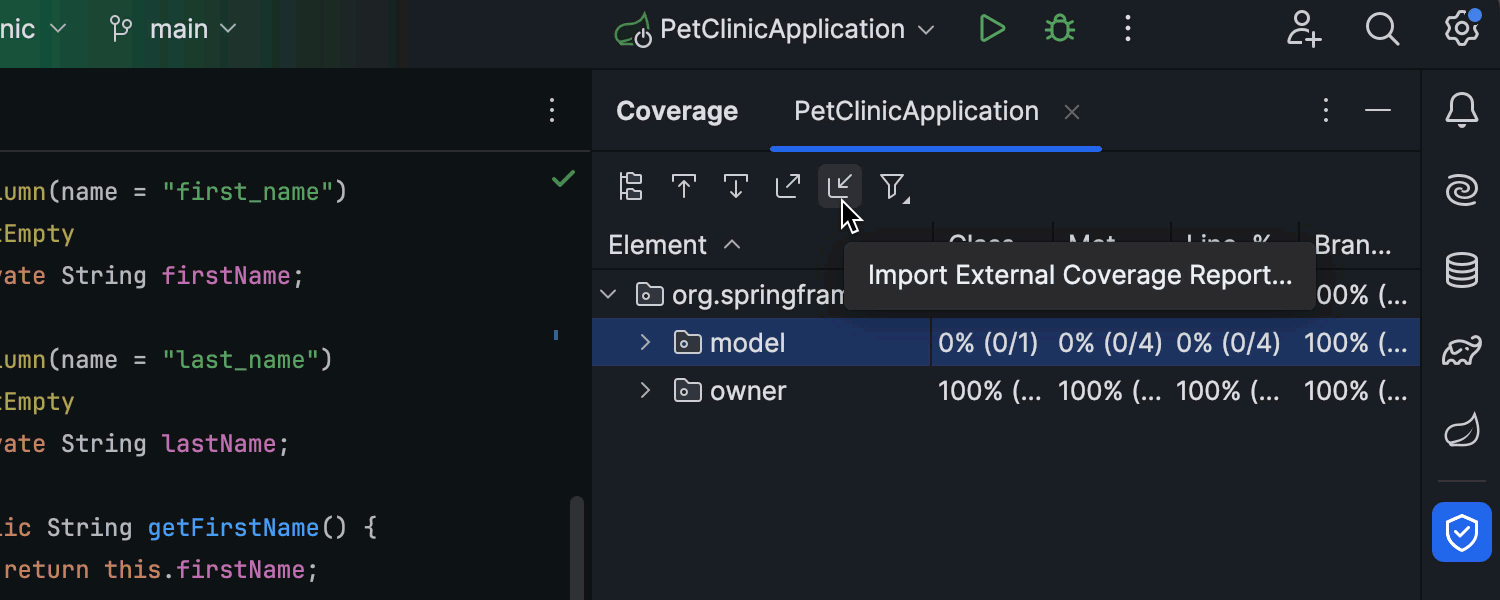 现在,可以更轻松地导入、浏览和分析 JaCoCo 运行程序在 CI/CD 管道中收集的代码覆盖率数据。 如果 Coverage(覆盖率)工具窗口中未显示报告,现在将显示用于导入 JaCoCo 报告的直接链接。 我们还更新了窗口的工具栏,添加了一个导入图标,这个图标允许您作为 .exec 文件检索 JaCoCo 报告。