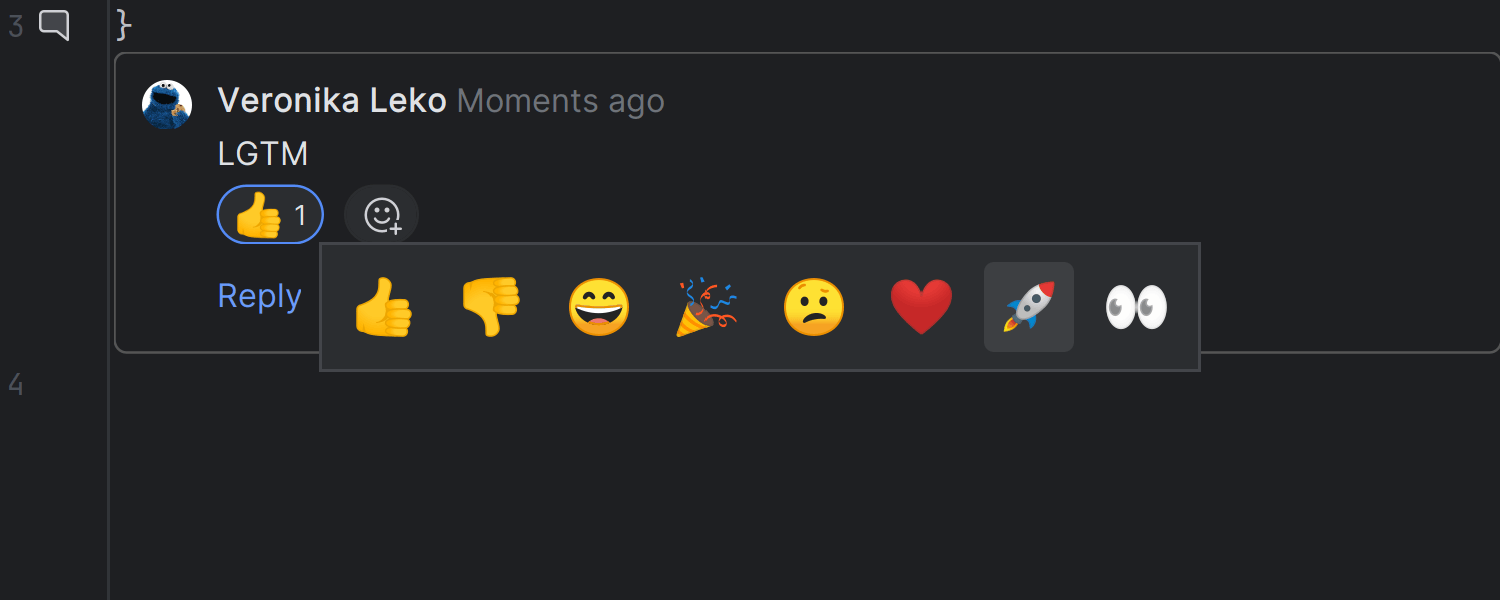IntelliJ IDEA 2024.1 开始支持对 GitHub 拉取请求和 GitLab 合并请求的审查评论发表回应,已有一组表情符号可供选择。