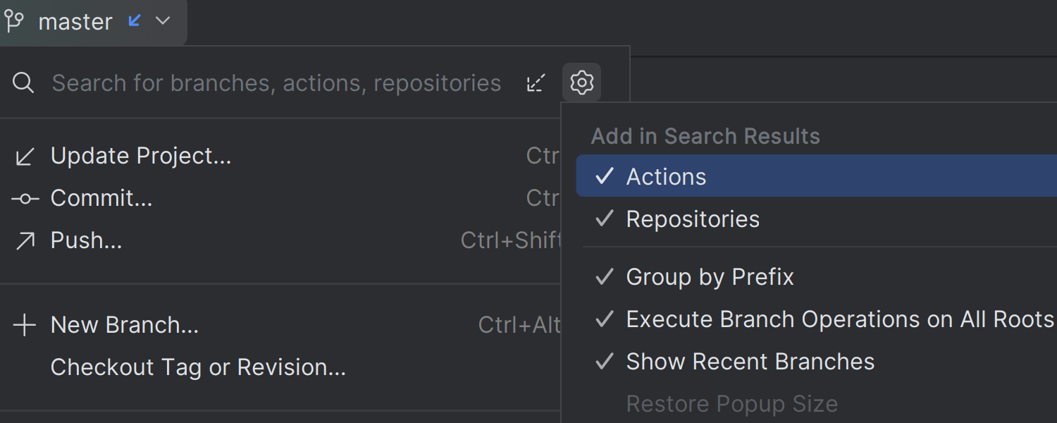 在 Branches(分支)弹出窗口中,您可以按操作和仓库筛选搜索结果,以在版本控制系统中更快、更精确地导航。