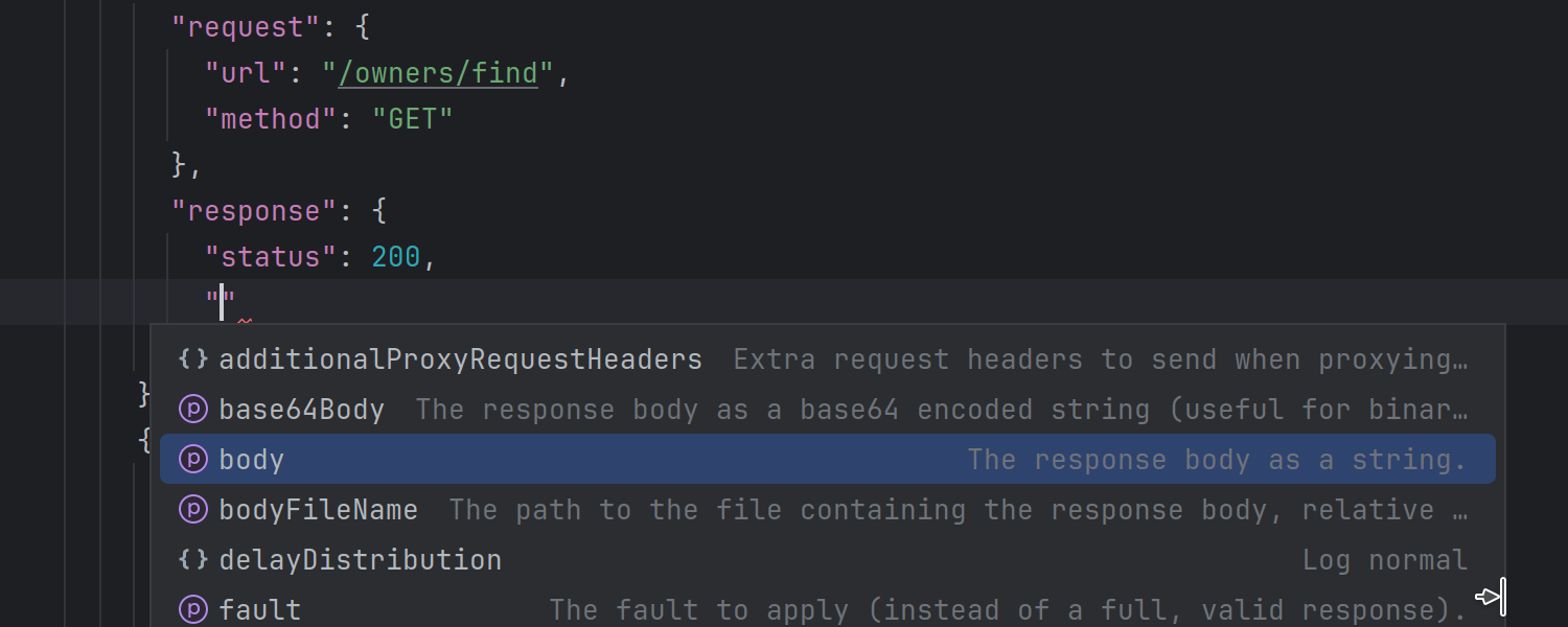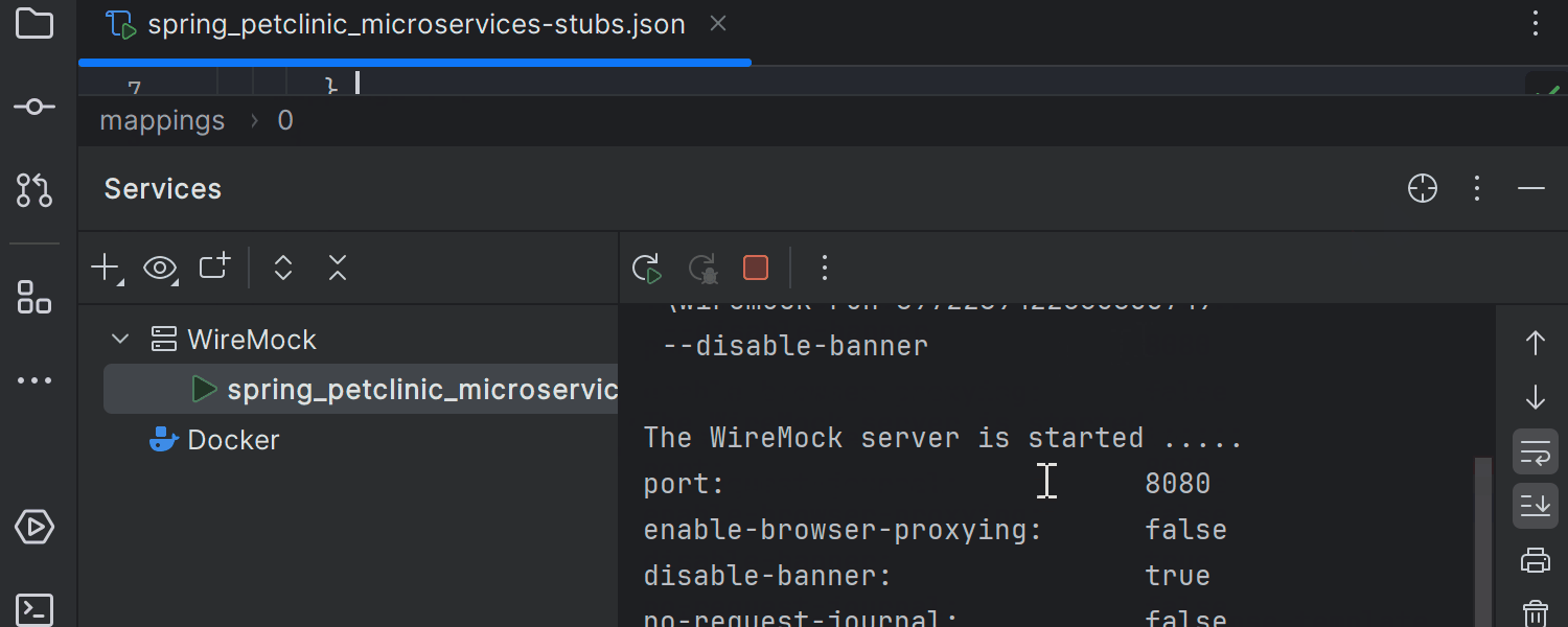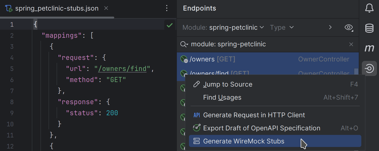 我们通过插件实现了 WireMock 支持,您可以从 IDE 内部安装或从 JetBrains Marketplace 获取。 此集成包括适用于 JSON 配置的架构补全、从 Endpoints(端点)工具窗口生成 WireMock 存根文件的功能,以及允许直接从编辑器启动服务器的内置运行配置。 新功能可让您快速创建测试数据服务器或存根,从而简化 Web UI 和微服务的开发。