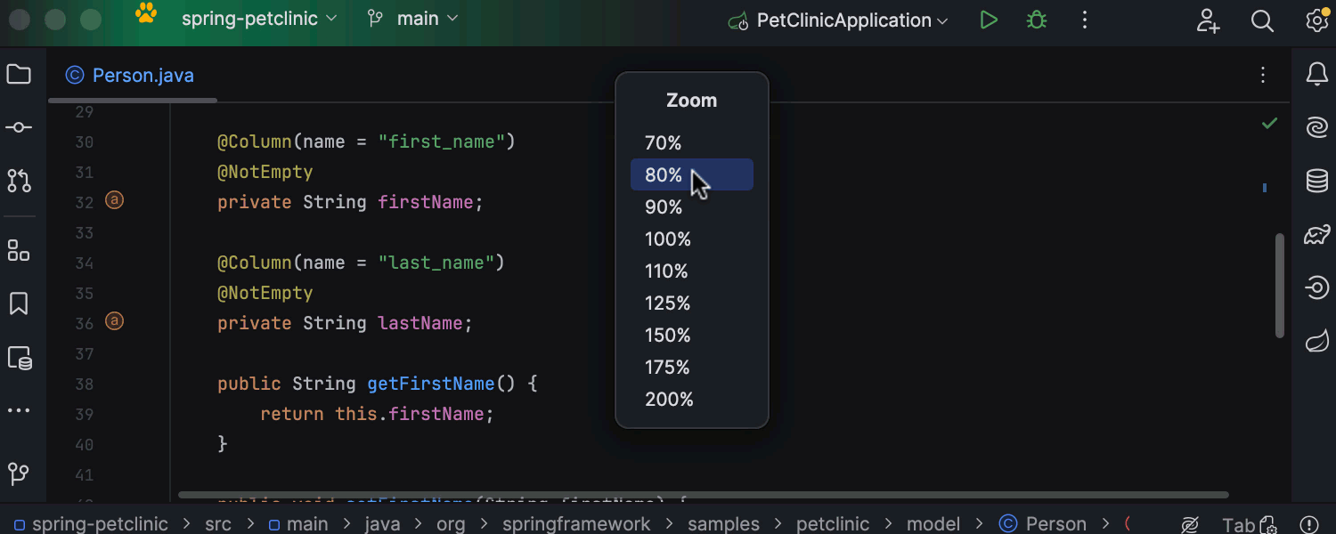 您现在可以将 IDE 缩小到 90%、80% 或 70%,从而可以灵活地调整 IDE 元素的大小。
