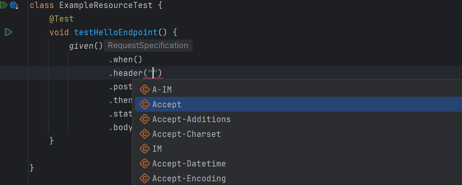 现在,HTTP 页眉可以在所有常见场景中轻松补全 ,例如使用 Spring WebClient 和 REST Assured 测试。 遇到预期值时,补全弹出窗口会自动出现。
