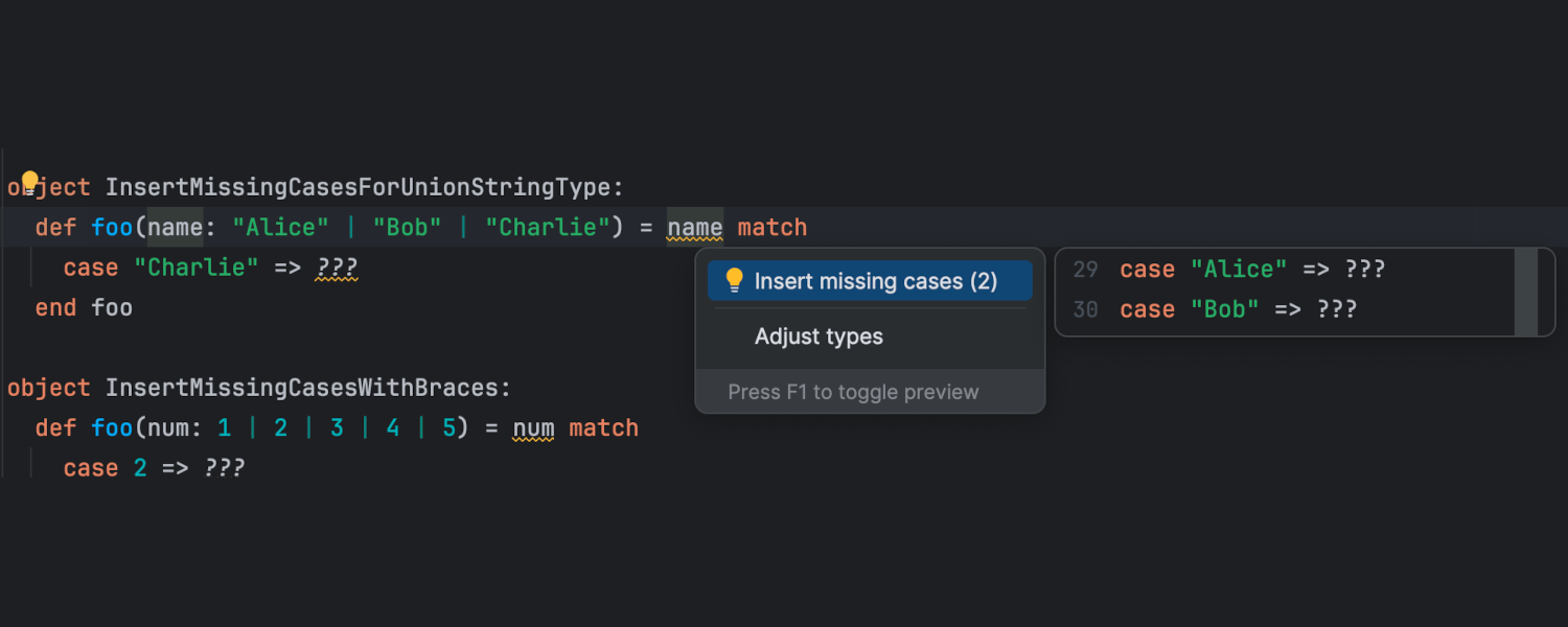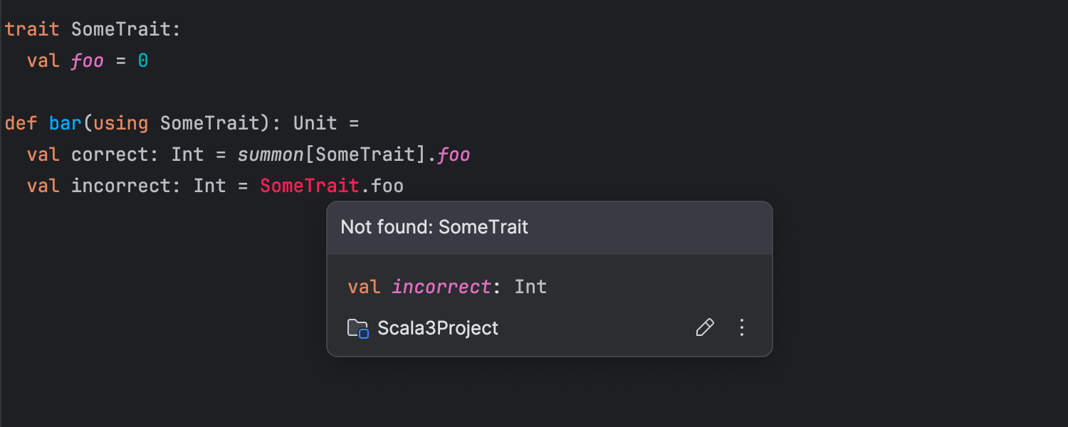 在新版本中,我们修正了许多与 Scala 3 中特定语法用例的处理相关的问题。 改进包括识别禁止的修饰符混合、计算缩进深度、在不破坏缩进的情况下剪切粘贴操作,以及将结束标记与其语法结构相关联的功能。 我们还改进了调试器中的 Scala 3 支持,自动补全现在可以准确处理一些极端情况,例如与 using 和 given 关键字或 unapply 签名一起使用时。