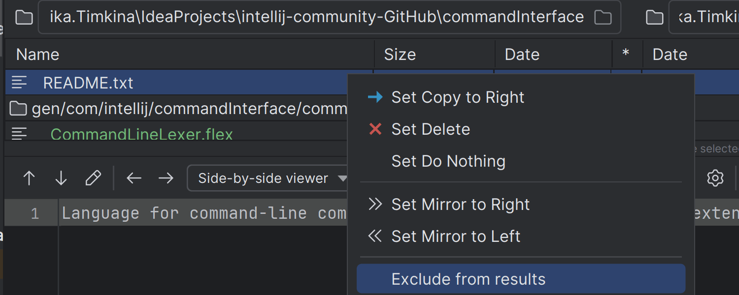 在差异查看器中,您可以指定在比较中要忽略的文件夹和文件,从而仅关注有意义的更改。 右键点击您不想在比较结果中看到的文件或文件夹,然后从上下文菜单中选择 Exclude from results(从结果中排除)。