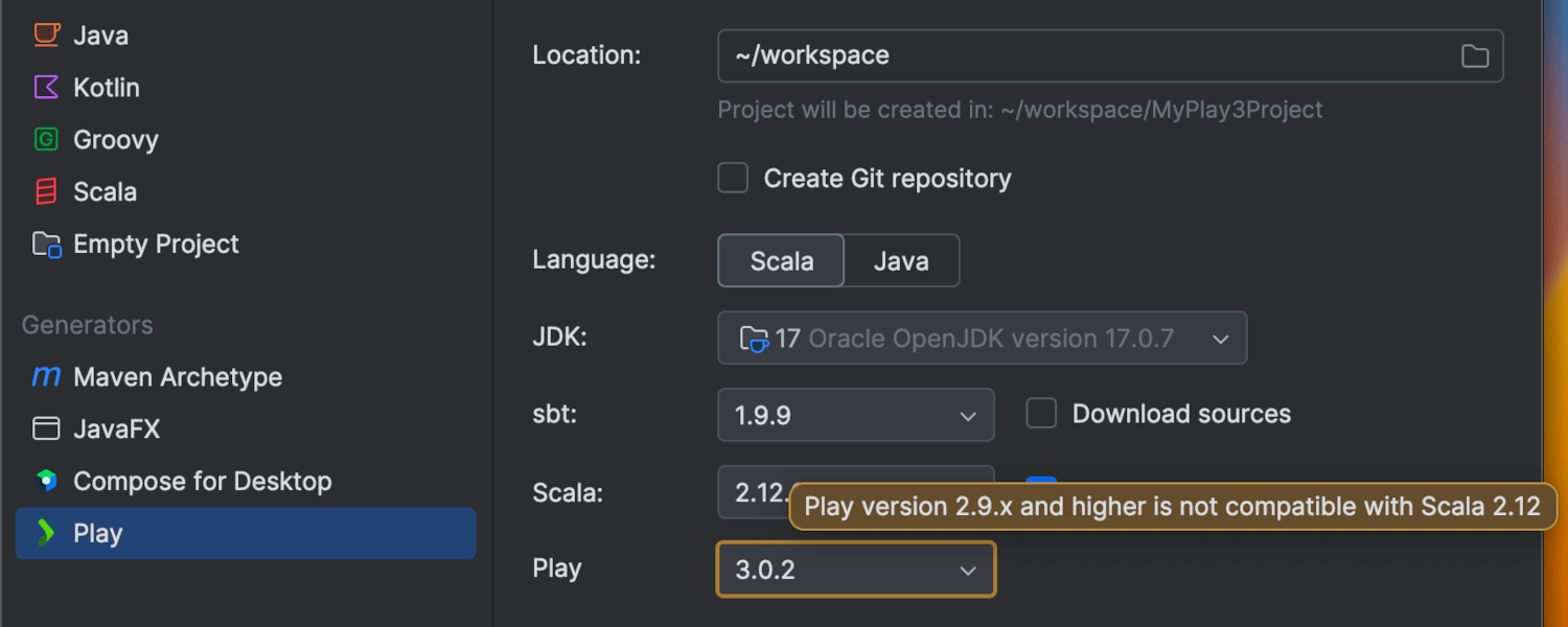 为了解决旧版 Play Framework(2.8 及更低版本)和 JDK 17 之间的兼容性问题,我们引入了一条警告,在 Play 向导中通知您使用了不兼容版本的 Play 和 JDK。
