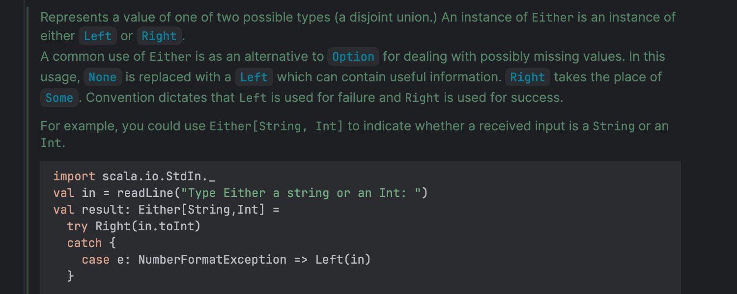 我们对 Scaladoc 弹出窗口和快速文档弹出窗口中类、特征和方法声明的高亮显示做出了许多细微的改进和修复。 嵌套泛型形参现在可以正确高亮显示,字段访问修饰符也会显示。 此外,带有三个大括号的 Scaladoc 块内的代码现在以与标准 Scala 代码相同的方式高亮显示。